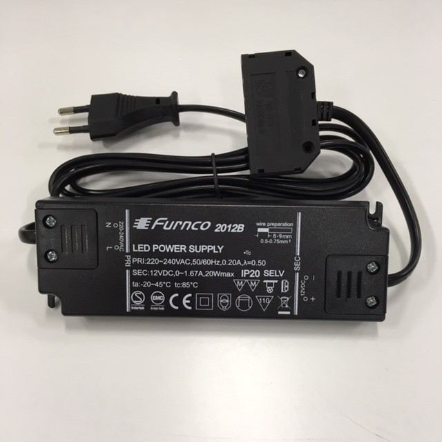 Led Driver 20W, IP20, med kopplingsplint för snabbkontakter. Sitter i spegelskåp/speglar med bredd 800/1000. Passar bl.a. Store, Edge, Afton och Gryning.