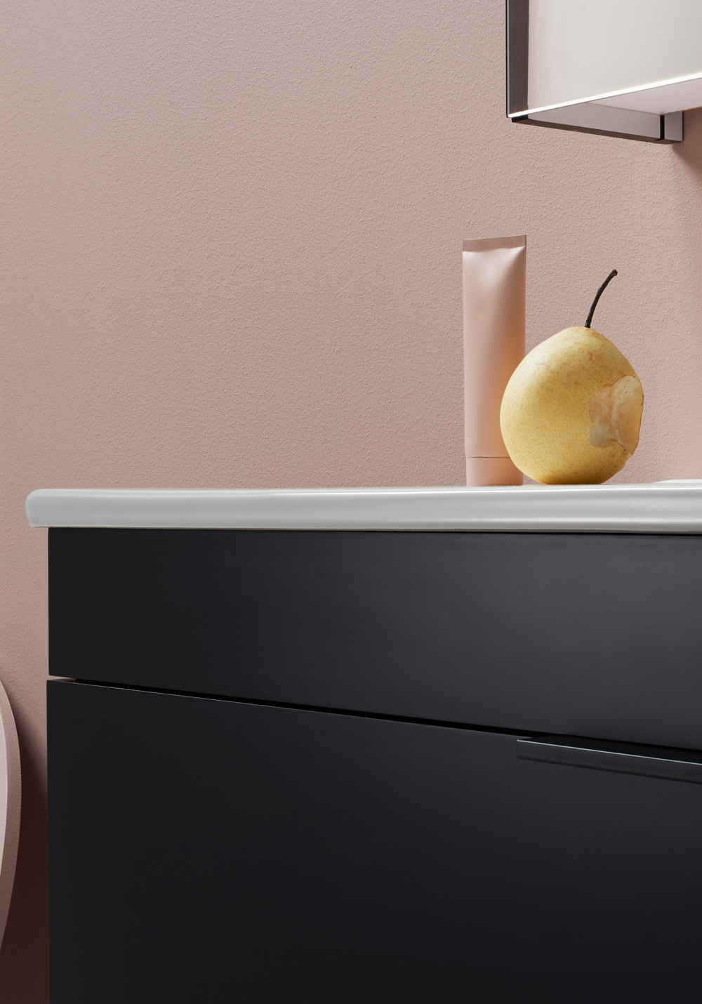 Servantskap i matt lakk i hvitt og svart eller hvit høyglans med mykstengende skuff som gir generøs oppbevaring.