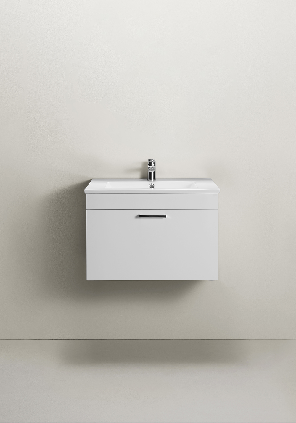 Servantskap med mykstengende skuff som gir generøs oppbevaring. Enkelt å installere for en person med skinne på veggen. Forberedt for både vegg- og gulvavløp i bakkant for enkel montering. Justerbare monteringsbraketter. Kompletter med servant og PUM-vannlås for kommode, 126 56 00. Sett din personlige stil med ett av våre håndtak og knotter.