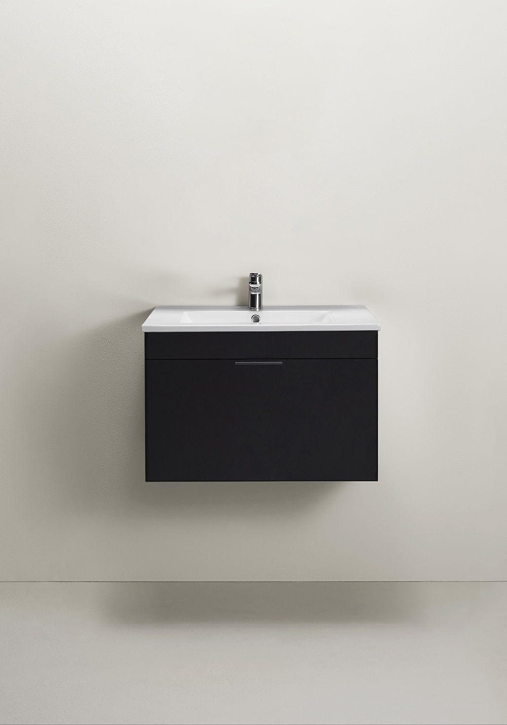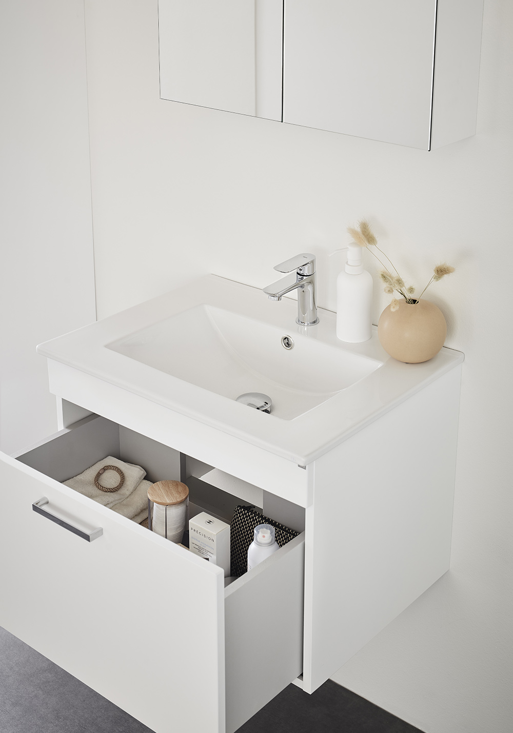 Servantskap med mykstengende skuff som gir generøs oppbevaring. Enkelt å installere for en person med skinne på veggen. Forberedt for både vegg- og gulvavløp i bakkant for enkel montering. Justerbare monteringsbraketter. Kompletter med servant og PUM-vannlås for kommode, 126 56 00. Sett din personlige stil med ett av våre håndtak og knotter.