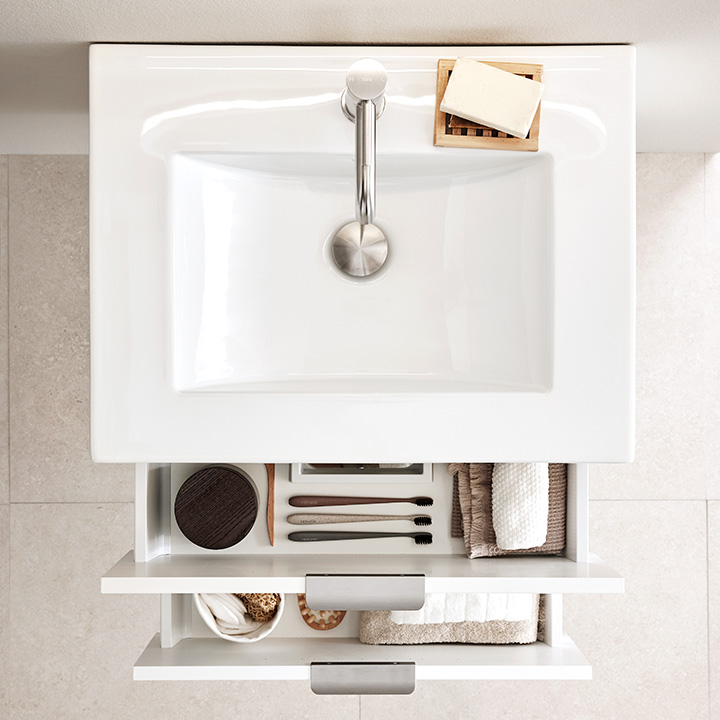 Hafa Go servantskap er praktiske og stilrene baderomsmøbler med glatte fronter. Kompletter med en servant og sett stilen din ved å legge til et av våre håndtak. To myktlukkende skuffer med fullt uttrekk gir god oversikt over innholdet.