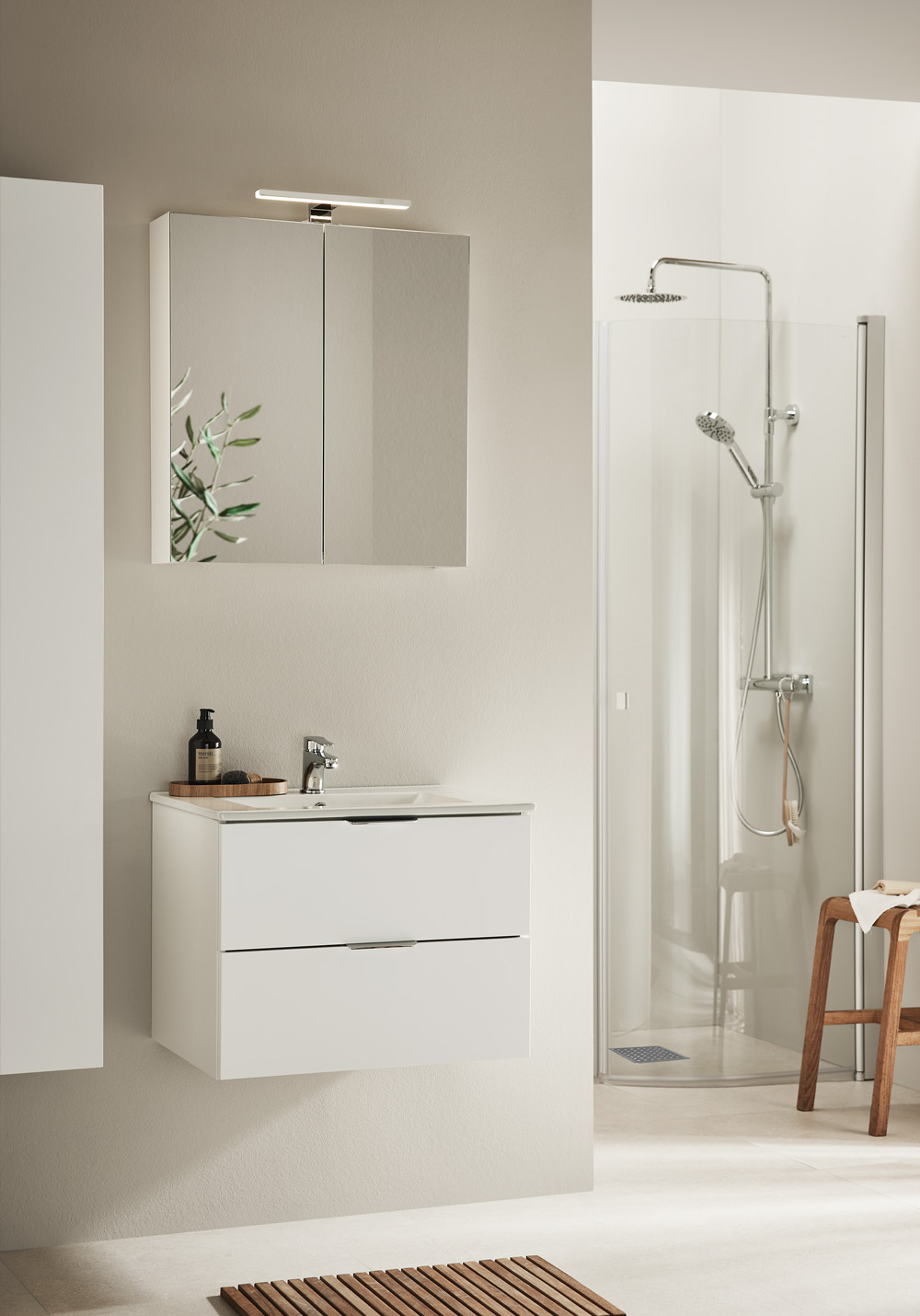 Hafa Go servantskap med porselensservant er praktiske og stilrene baderomsmøbler med glatte fronter og mulighet for deg å sette din stil ved å legge til et av våre håndtak. To myktlukkende skuffer med fullt uttrekk gir god oversikt over innholdet.