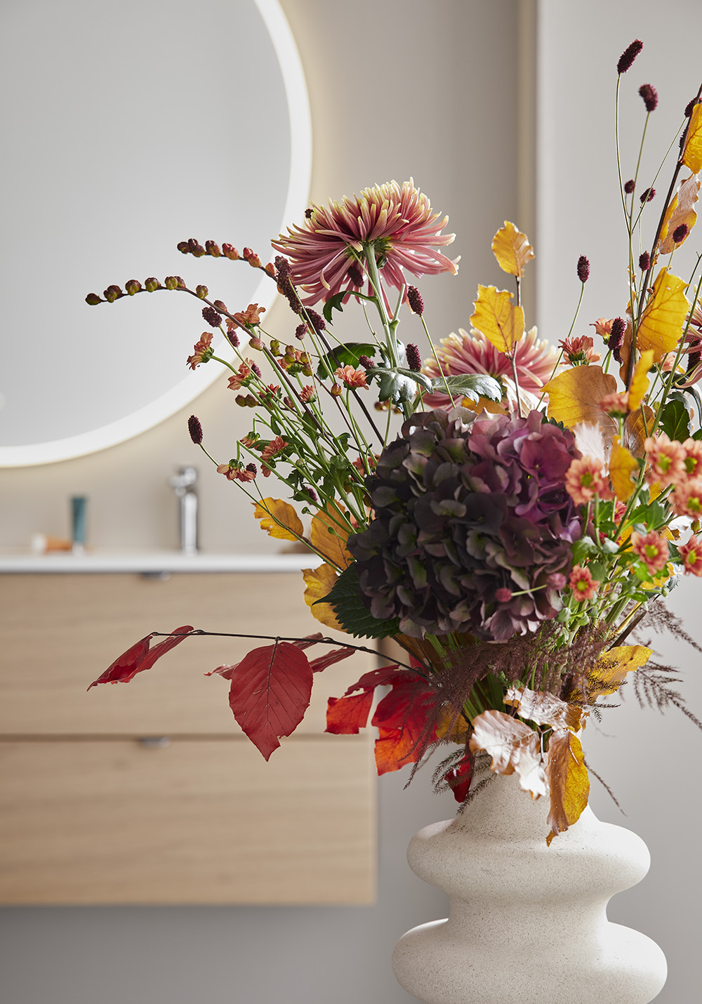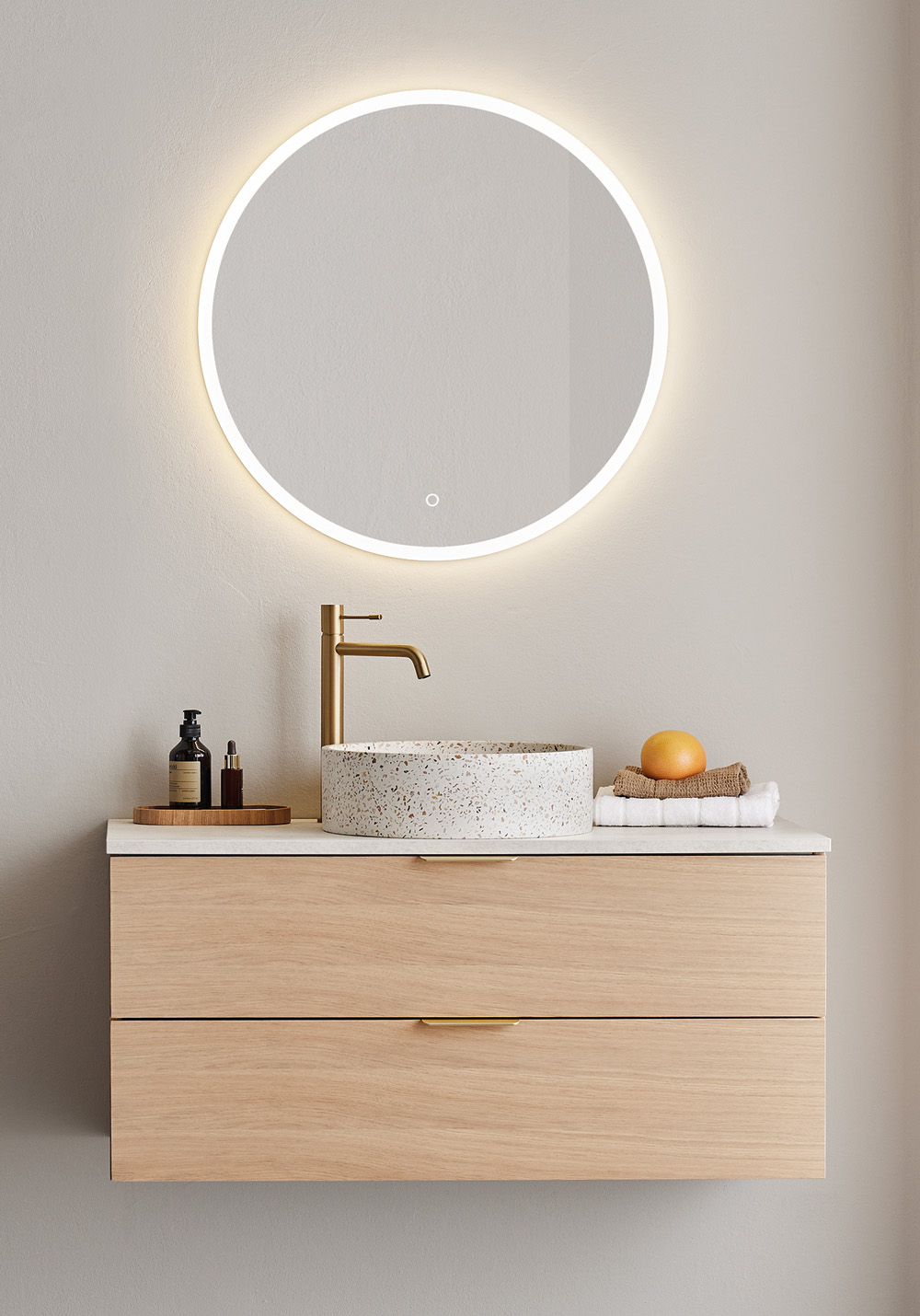 Baderomsskapet er ferdig montert og enkelt å montere med veggskinne og justerbare opphengsbeslag samt plass tilrettelagt for både vegg- og gulvavløp. Hafa Go baderomsskap finnes i flere ulike størrelser og farger, enten med mattlakkert overflate eller mattlakkert eikefiner. Kjøp til servant, håndtak, blandebatteri, bunnventil, vannlås og stikkontakt.