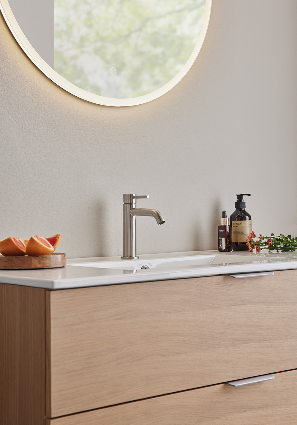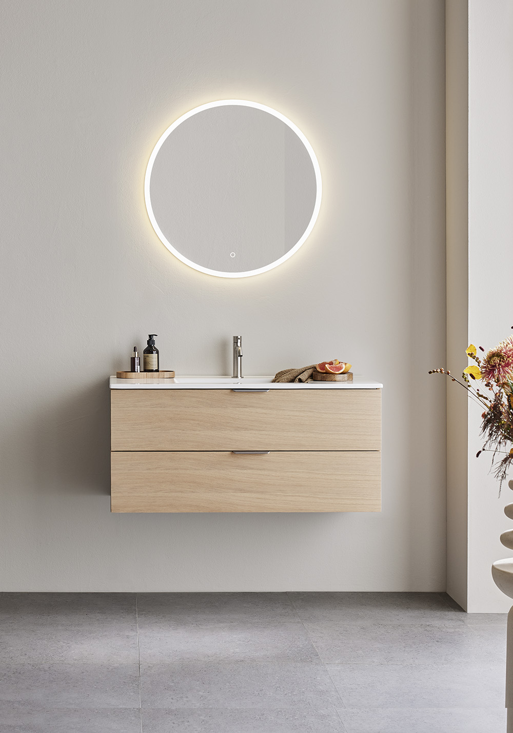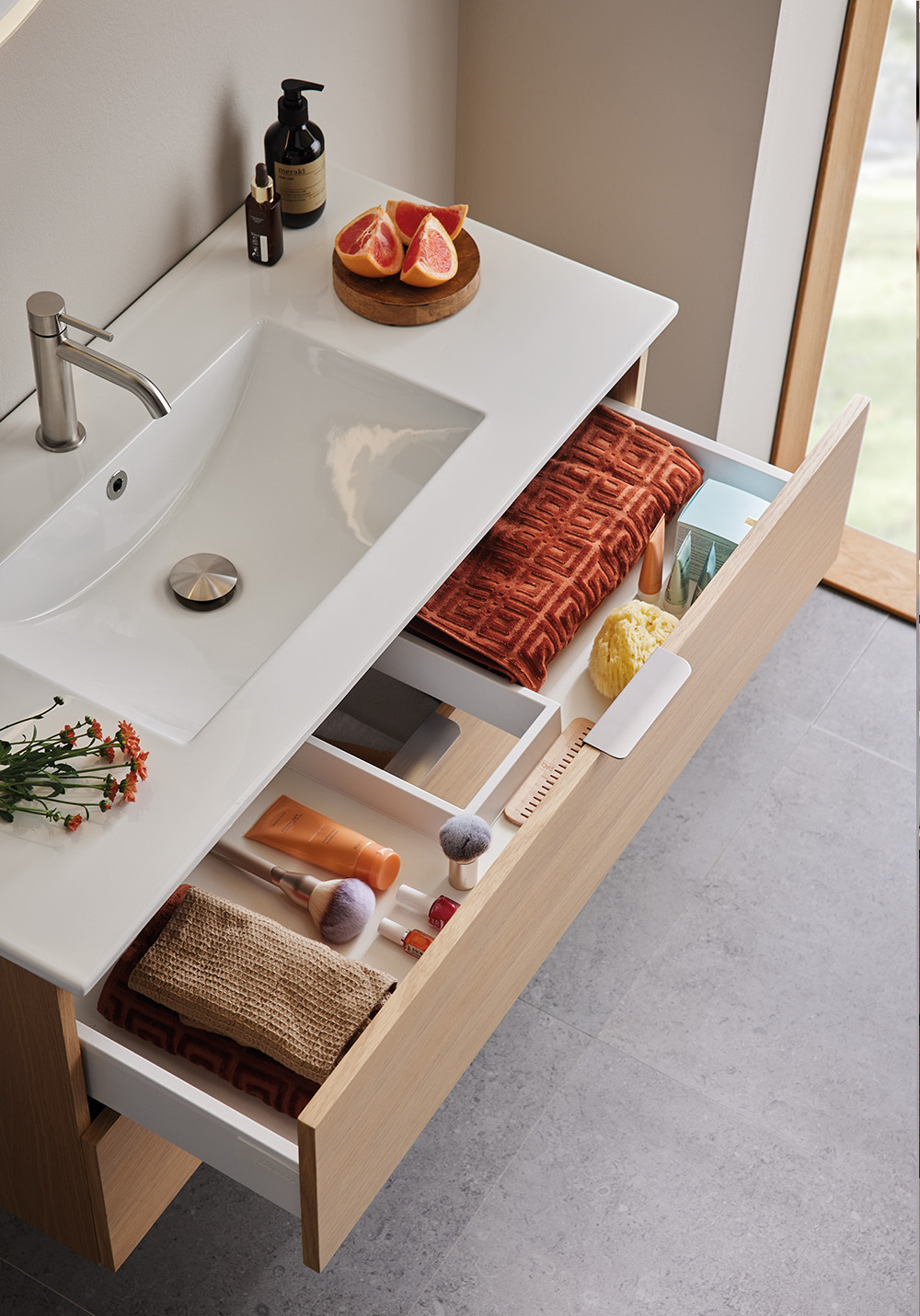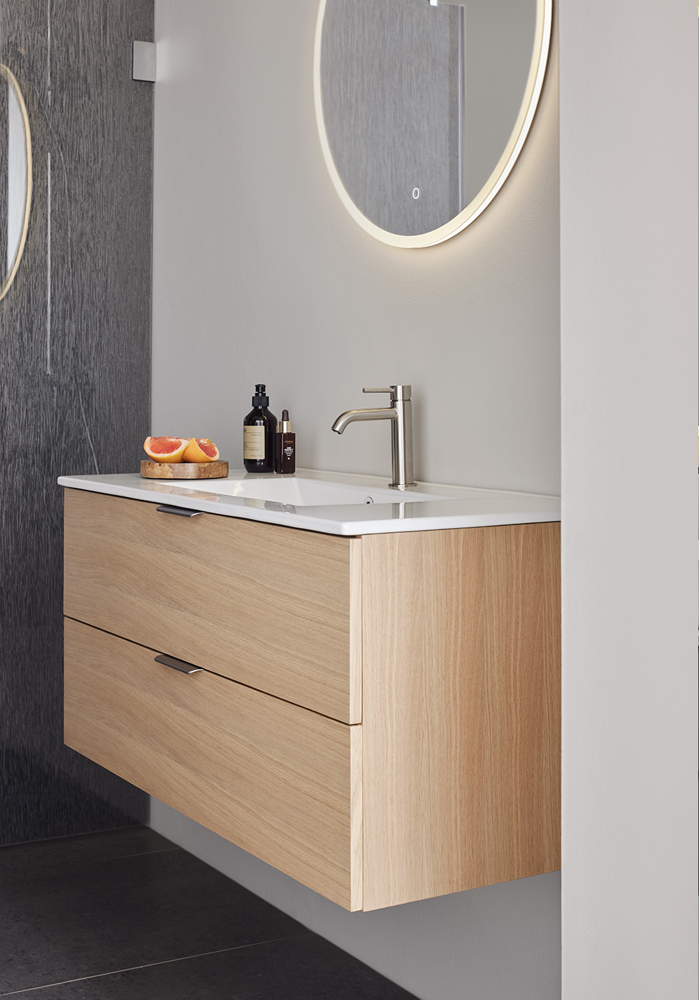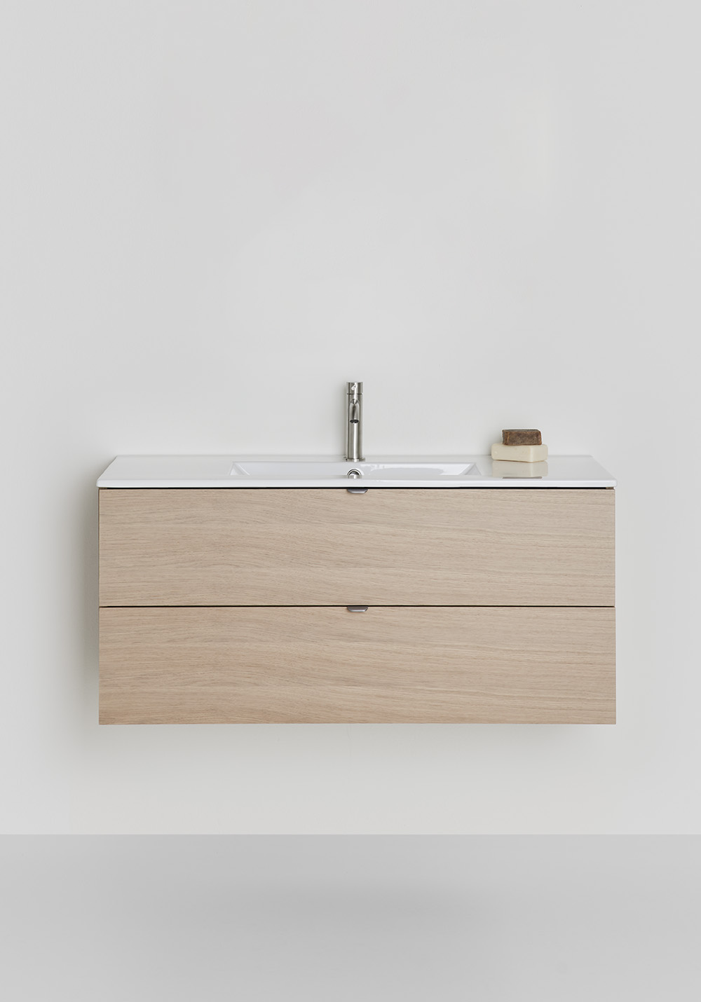 Hafa Go servantskap er praktiske og stilrene baderomsmøbler med glatte fronter. Kompletter med en servant og sett stilen din ved å legge til et av våre håndtak. To myktlukkende skuffer med fullt uttrekk gir god oversikt over innholdet.