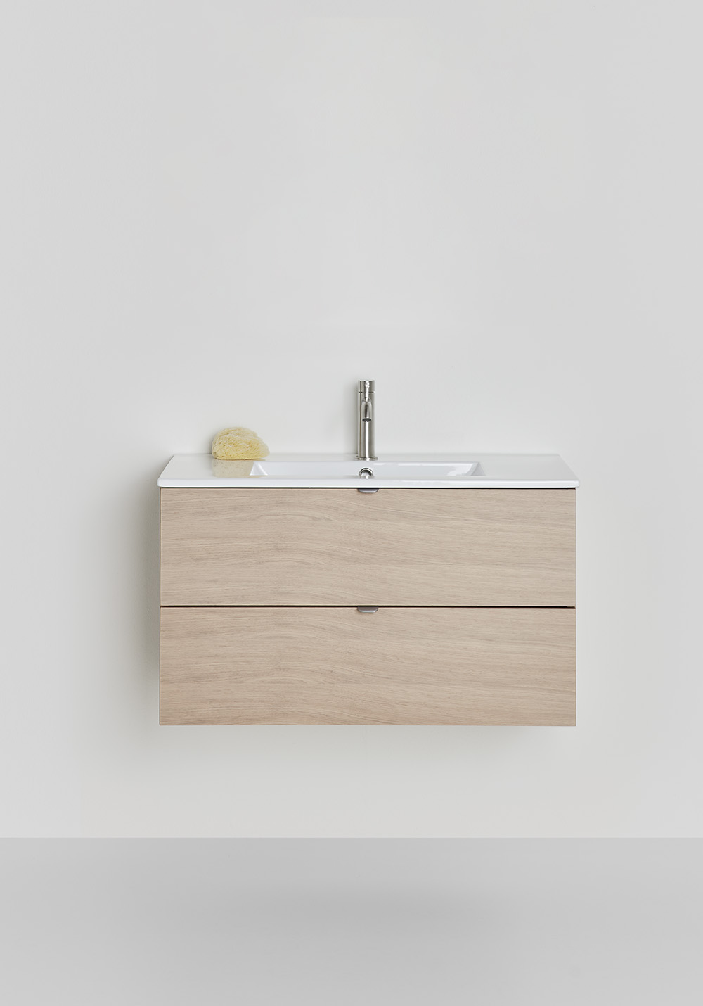 Baderomsskapet er ferdig montert og enkelt å montere med veggskinne og justerbare opphengsbeslag samt plass tilrettelagt for både vegg- og gulvavløp. Servanten har overløpsbeskyttelse og store avlastningsoverflater. Hafa Go baderomsskap finnes i flere ulike størrelser og farger, enten med mattlakkert overflate eller mattlakkert eikefiner. Kjøp til håndtak, blandebatteri, bunnventil, vannlås og stikkontakt.