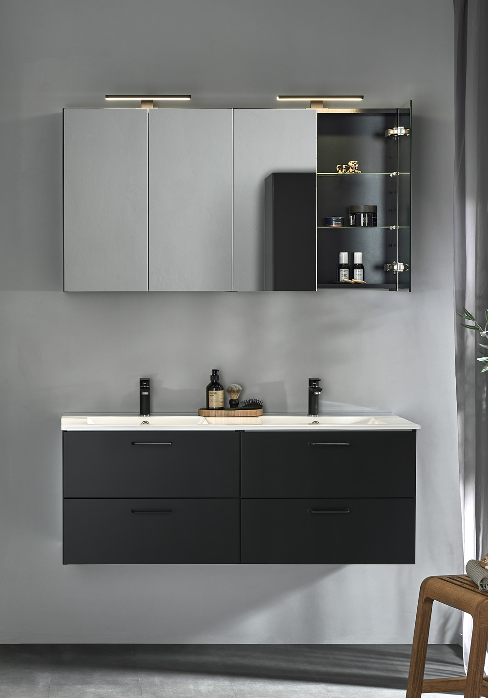 Baderomsskapet er ferdig montert og enkelt å montere med veggskinne og justerbare opphengsbeslag samt plass tilrettelagt for både vegg- og gulvavløp. Hafa Go baderomsskap finnes i flere bredder fra 600 opp til 1200 og i matt hvit og svart. Kjøp til servant, håndtak, blandebatteri, bunnventil, vannlås og stikkontakt.