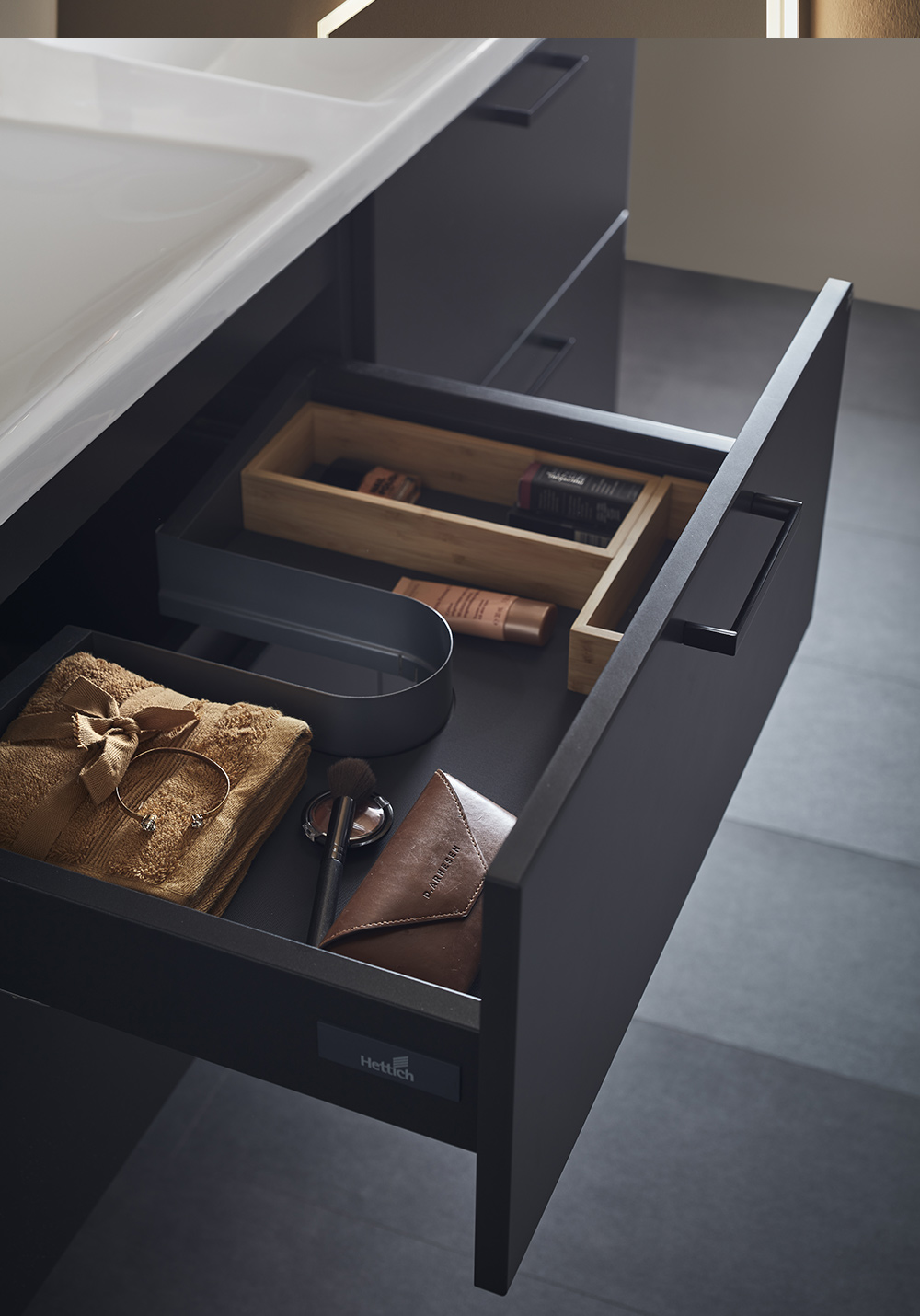 Mykstengende skuffer med fulluttrekk gir god oversikt over innholdet. Skuffematter og skuffeinnredning av bambus hjelper til med å holder orden. Baderomsskapet er ferdigmontert og enkelt å montere med justerbare opphengsbraketter og plass tilrettelagt for både vegg- og gulvavløp. Sidemodulen gir mulighet til å lage ytterligere varianter og kombinere et baderomsmøbel som passer akkurat ditt baderom. Velg håndtak eller knott som passer din stil og kompletter med frittstående servant på en benkeplate eller nedsenket servant i porselen. Kjøp til blandebatteri, bunnventil, vannlås, skuffebelysning og stikkontakt.