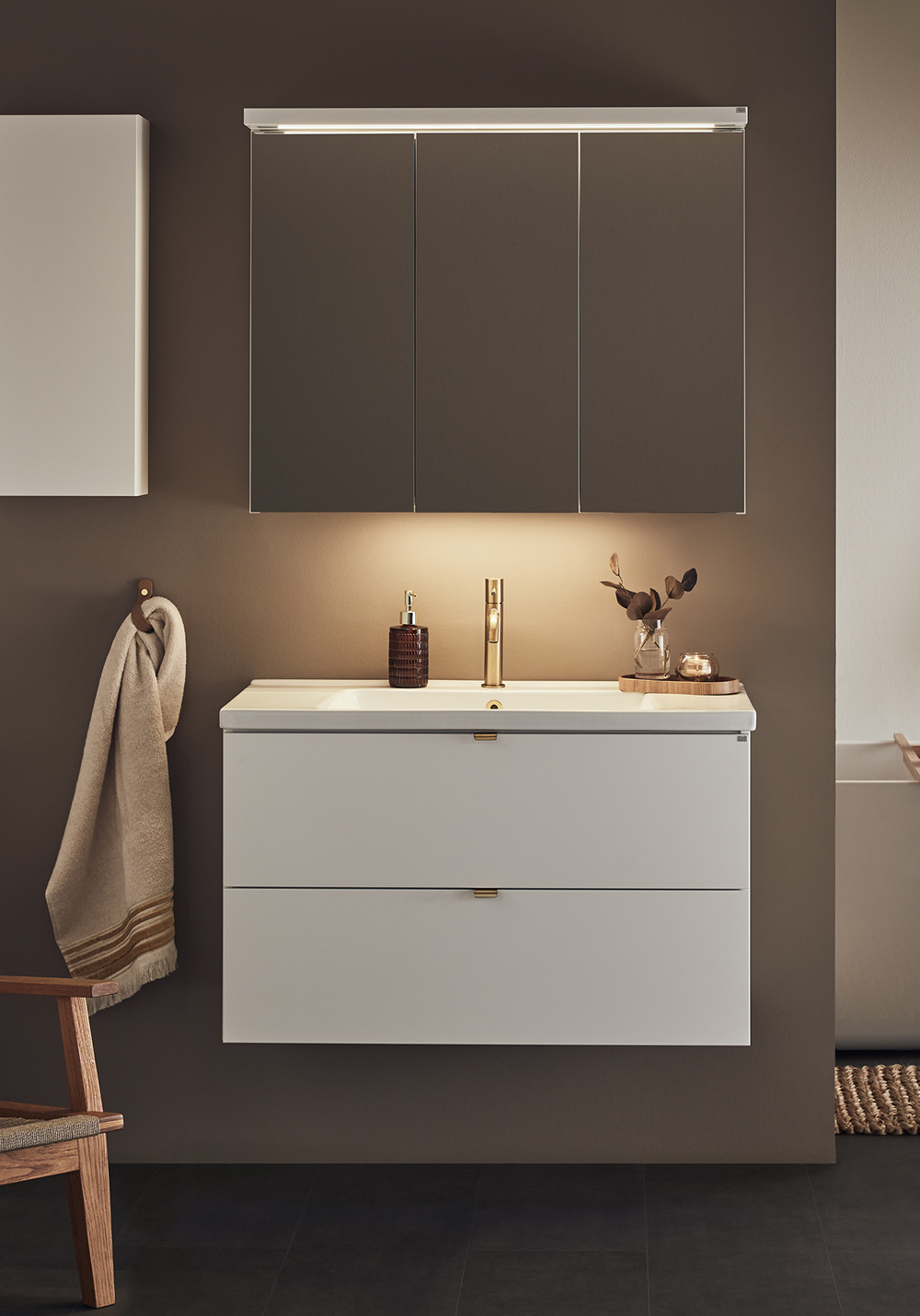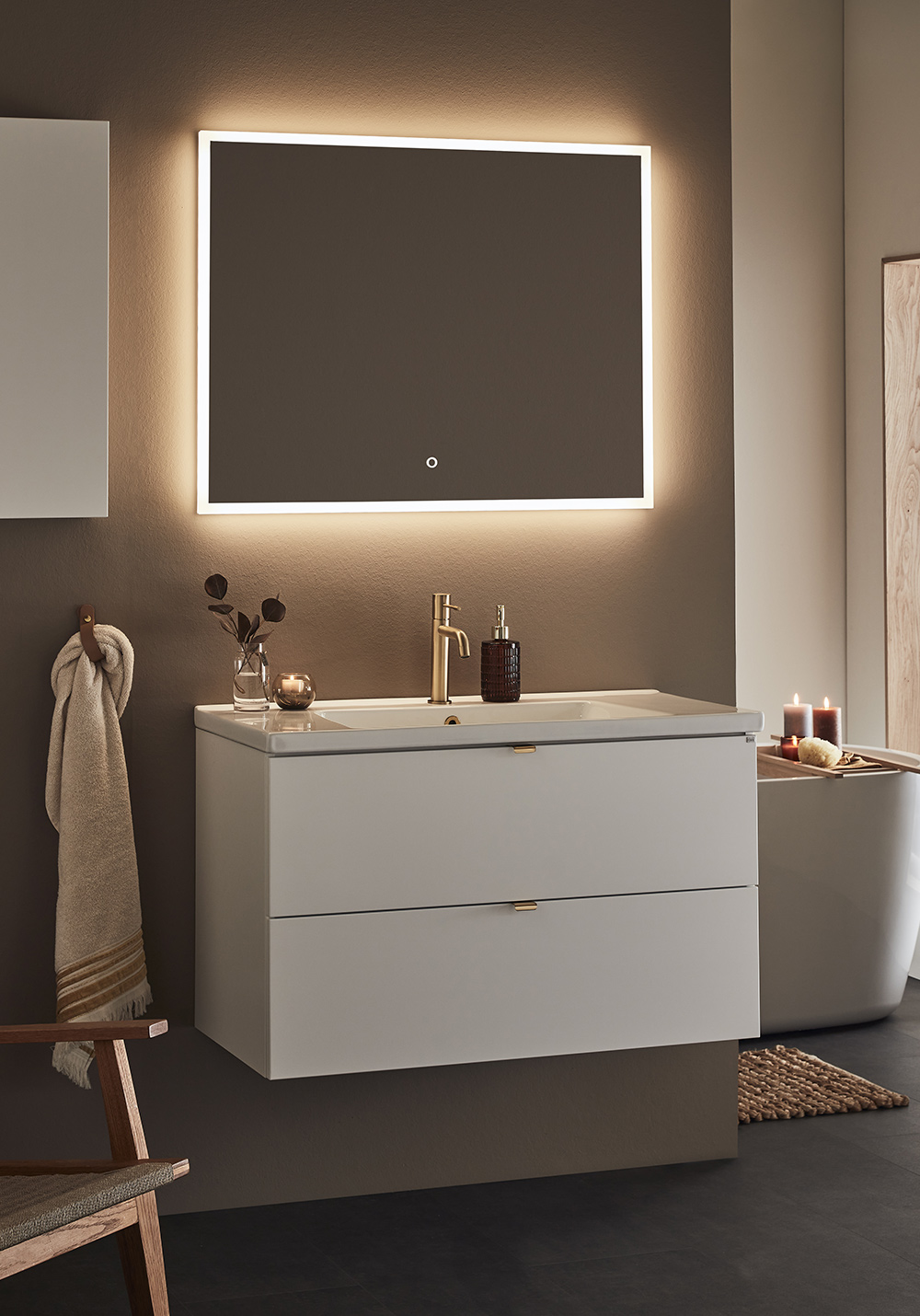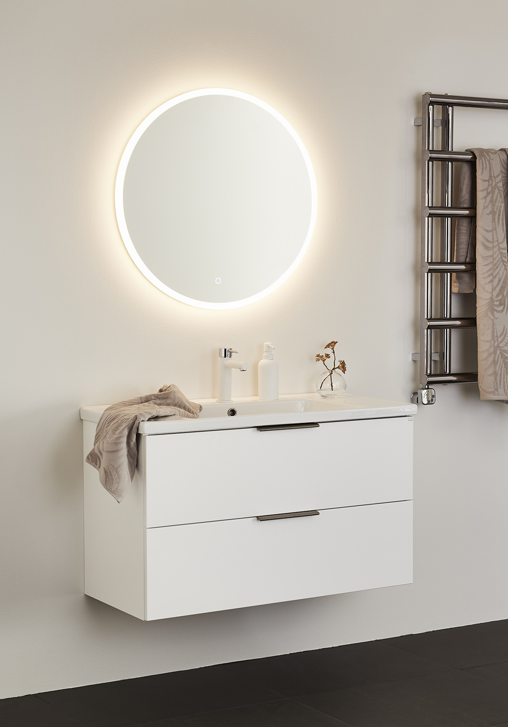 Mykstengende skuffer med fulluttrekk gir god oversikt over innholdet. Skuffematter og skuffeinnredning av bambus hjelper til med å holder orden. Baderomsskapet er ferdigmontert og enkelt å montere med justerbare opphengsbraketter og plass tilrettelagt for både vegg- og gulvavløp. Sidemodulen gir mulighet til å lage ytterligere varianter og kombinere et baderomsmøbel som passer akkurat ditt baderom. Velg håndtak eller knott som passer din stil og kompletter med frittstående servant på en benkeplate eller nedsenket servant i porselen. Kjøp til blandebatteri, bunnventil, vannlås, skuffebelysning og stikkontakt.