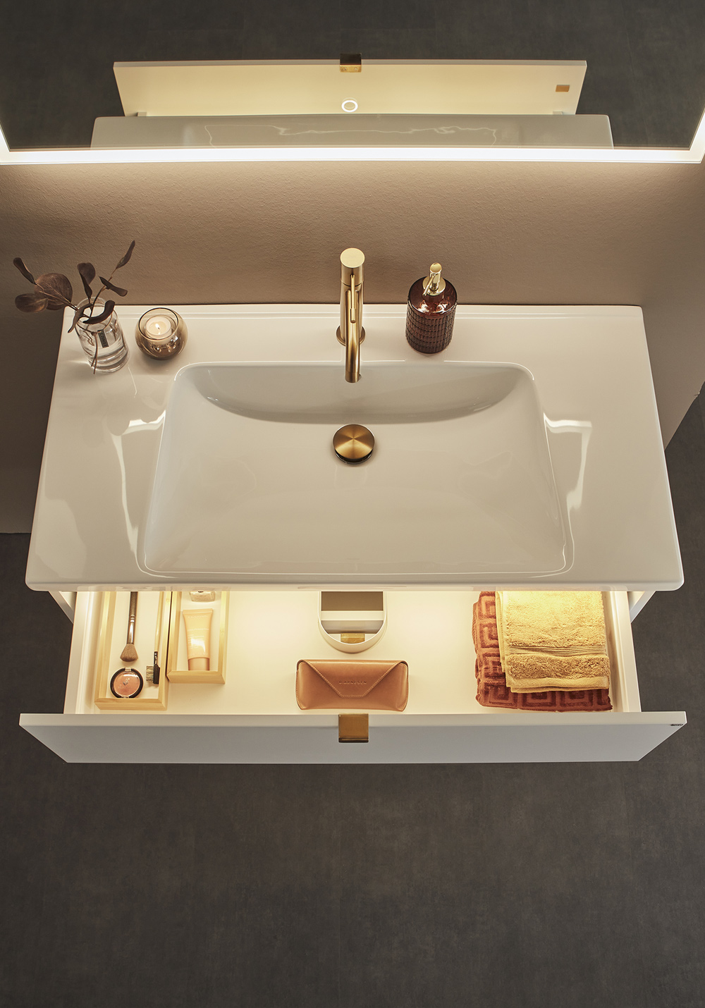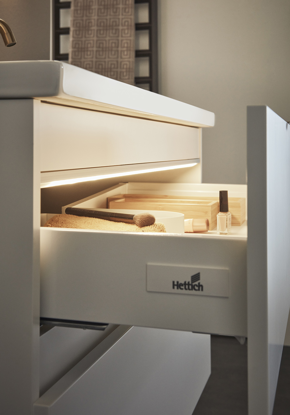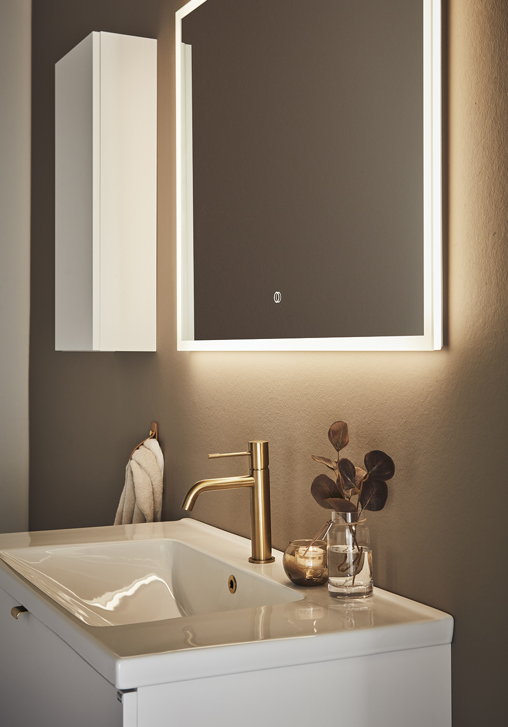 Mykstengende skuffer med fulluttrekk gir god oversikt over innholdet. Skuffematter og skuffeinnredning av bambus hjelper til med å holder orden. Baderomsskapet er ferdigmontert og enkelt å montere med justerbare opphengsbraketter og plass tilrettelagt for både vegg- og gulvavløp. Sidemodulen gir mulighet til å lage ytterligere varianter og kombinere et baderomsmøbel som passer akkurat ditt baderom. Velg håndtak eller knott som passer din stil og kompletter med frittstående servant på en benkeplate eller nedsenket servant i porselen. Kjøp til blandebatteri, bunnventil, vannlås, skuffebelysning og stikkontakt.