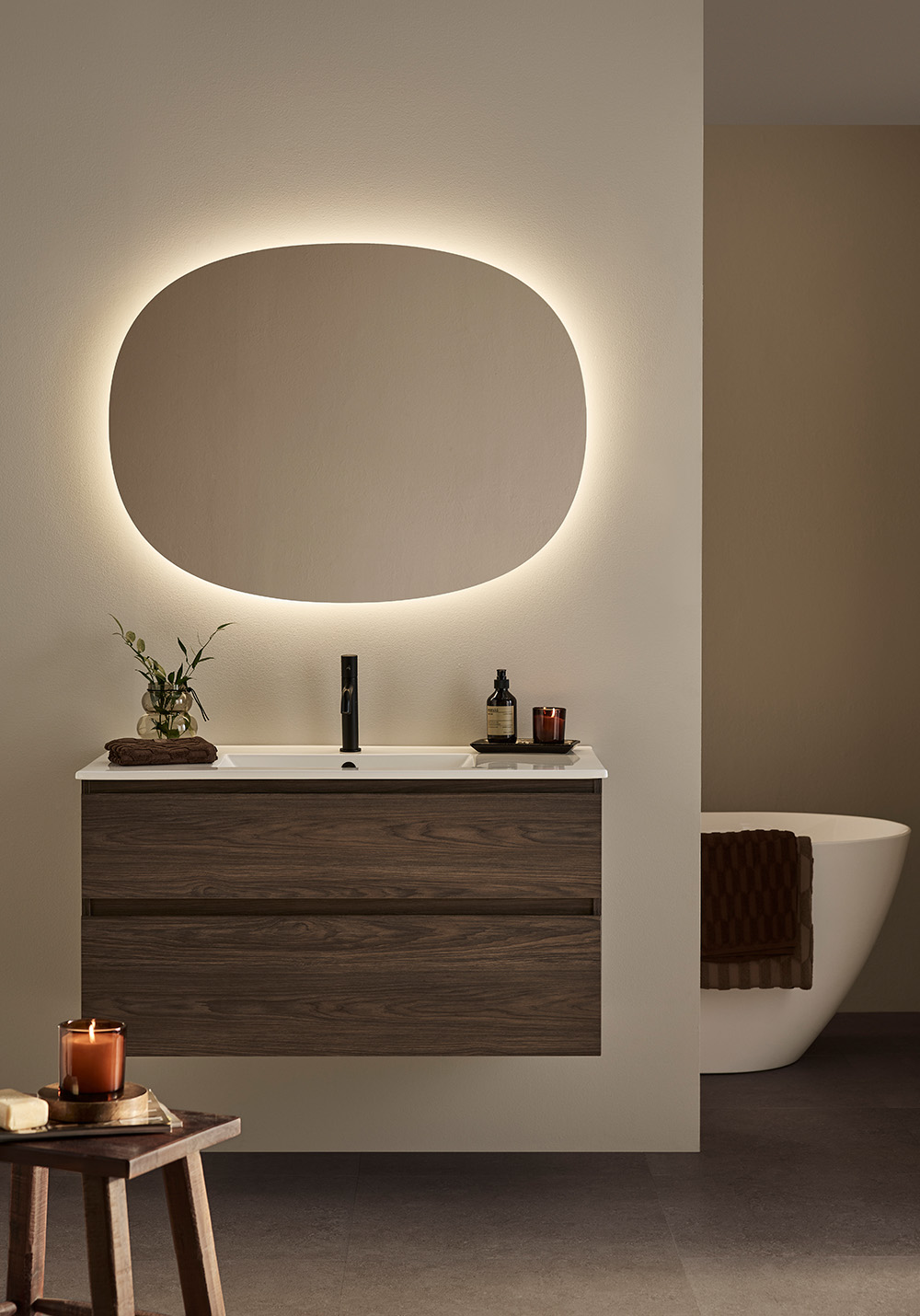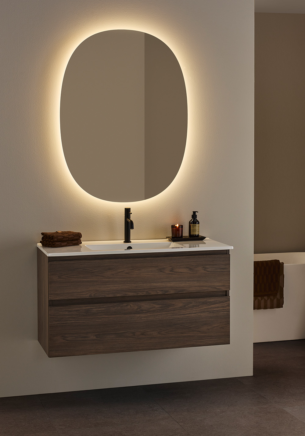 Servantskapet Hafa Style brun eik har et integrert håndtak som gir møbelet et stilrent design. De to skuffene har myk lukking, skuffematter og fullt uttrekk, slik at du enkelt kommer til alt du trenger. Kjøp til servant, blandebatteri, bunnventil, vannlås, stikkontakt.