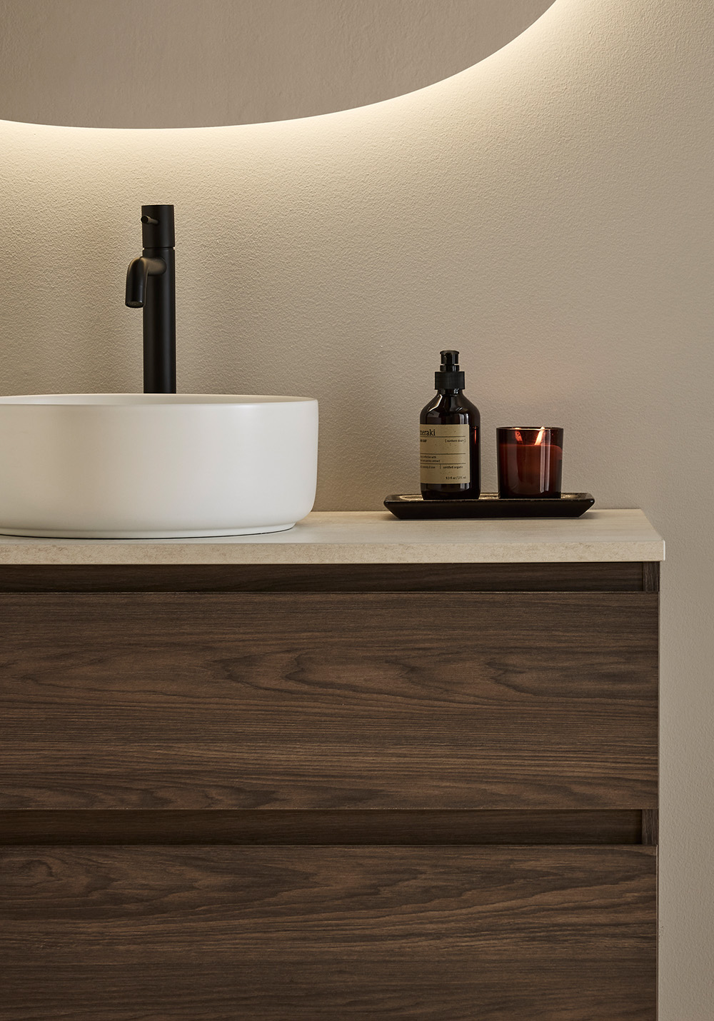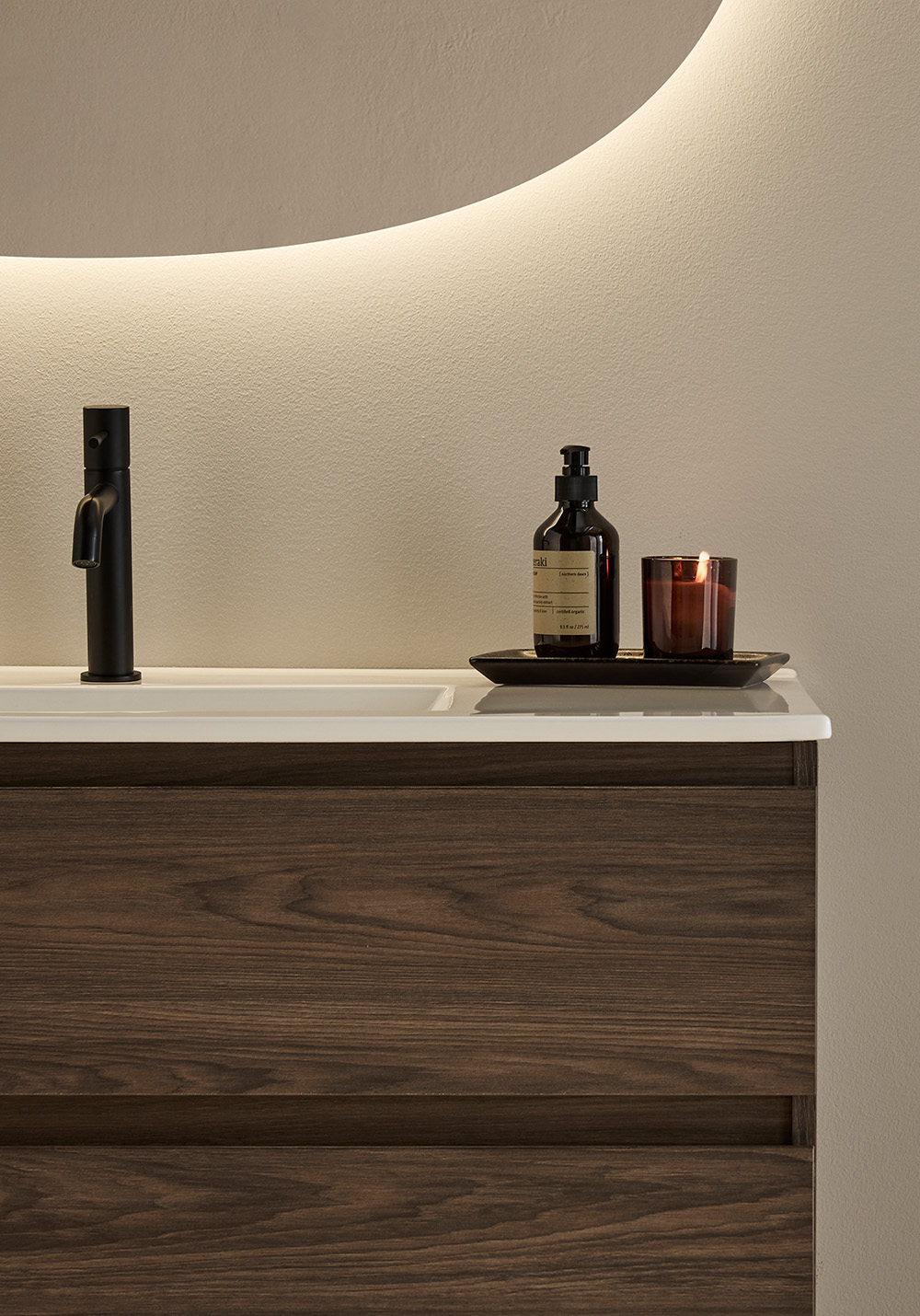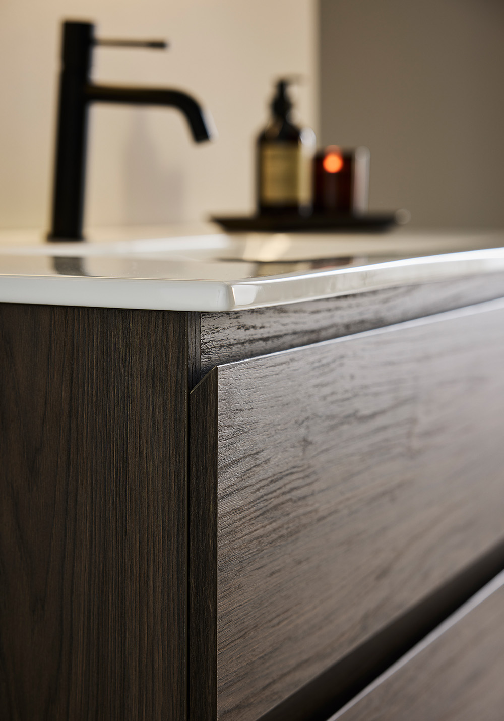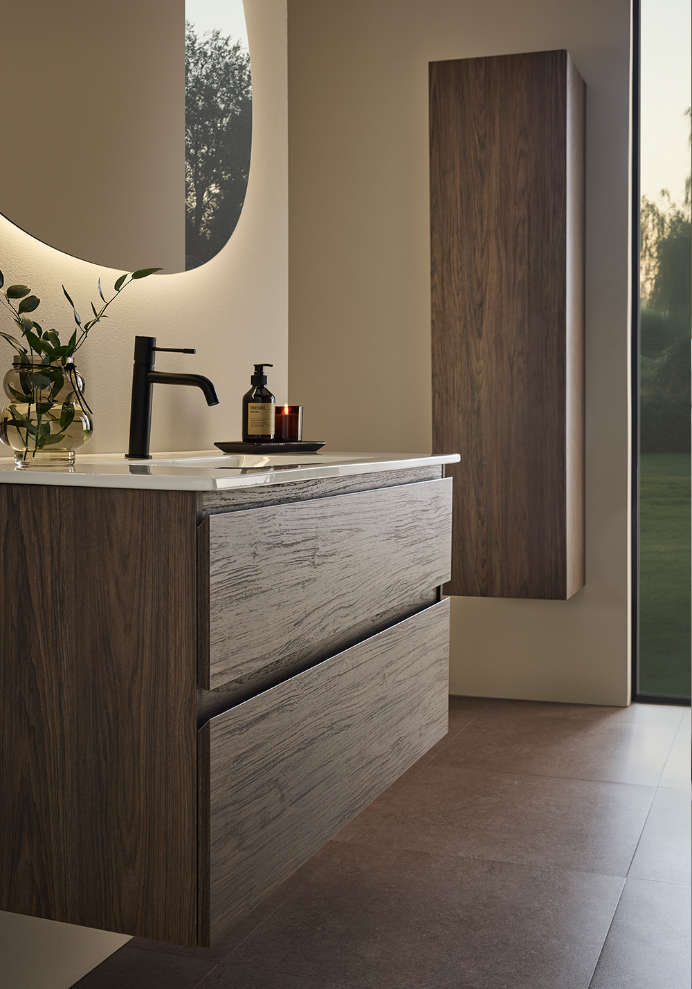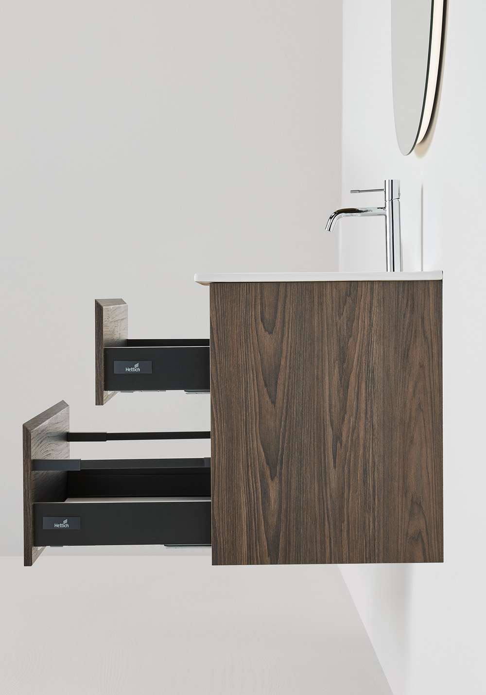 Servantskapet Hafa Style brun eik har et integrert håndtak som gir møbelet et stilrent design. De to skuffene har myk lukking, skuffematter og fullt uttrekk, slik at du enkelt kommer til alt du trenger. Kjøp til servant, blandebatteri, bunnventil, vannlås, stikkontakt.