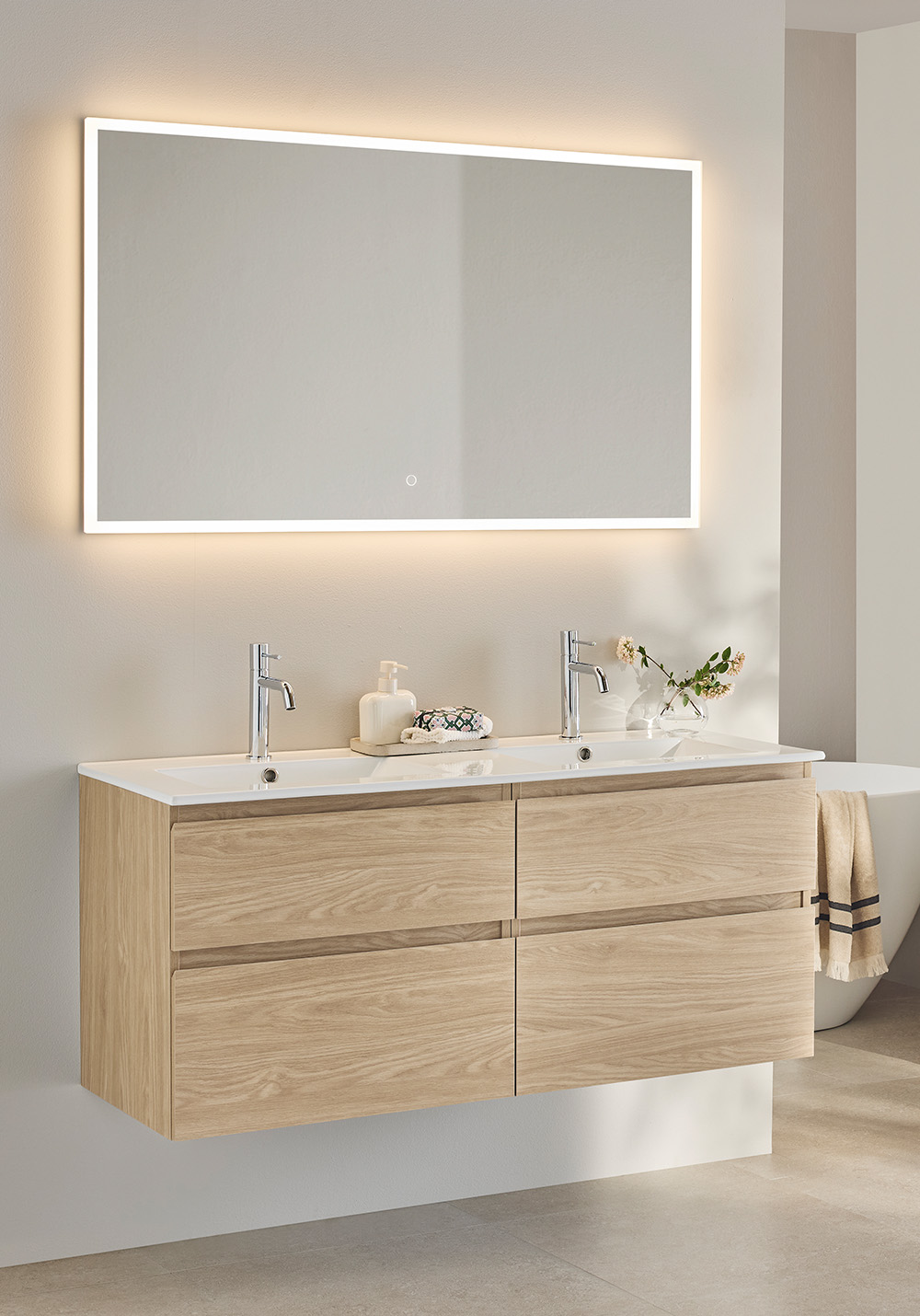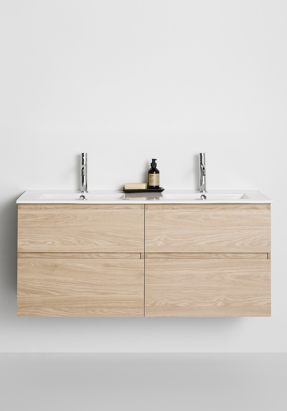 Hafa Style servantskap finnes i breddene 600, 800, 1000 og 1200 og i fargene hvitlakkert matt og vakker mønstret overflate i eik eller brun eik. Baderomsskapet er enkelt å montere med veggskinne og justerbare opphengsbeslag. Det er også forberedt for både vegg- og gulvavløp.