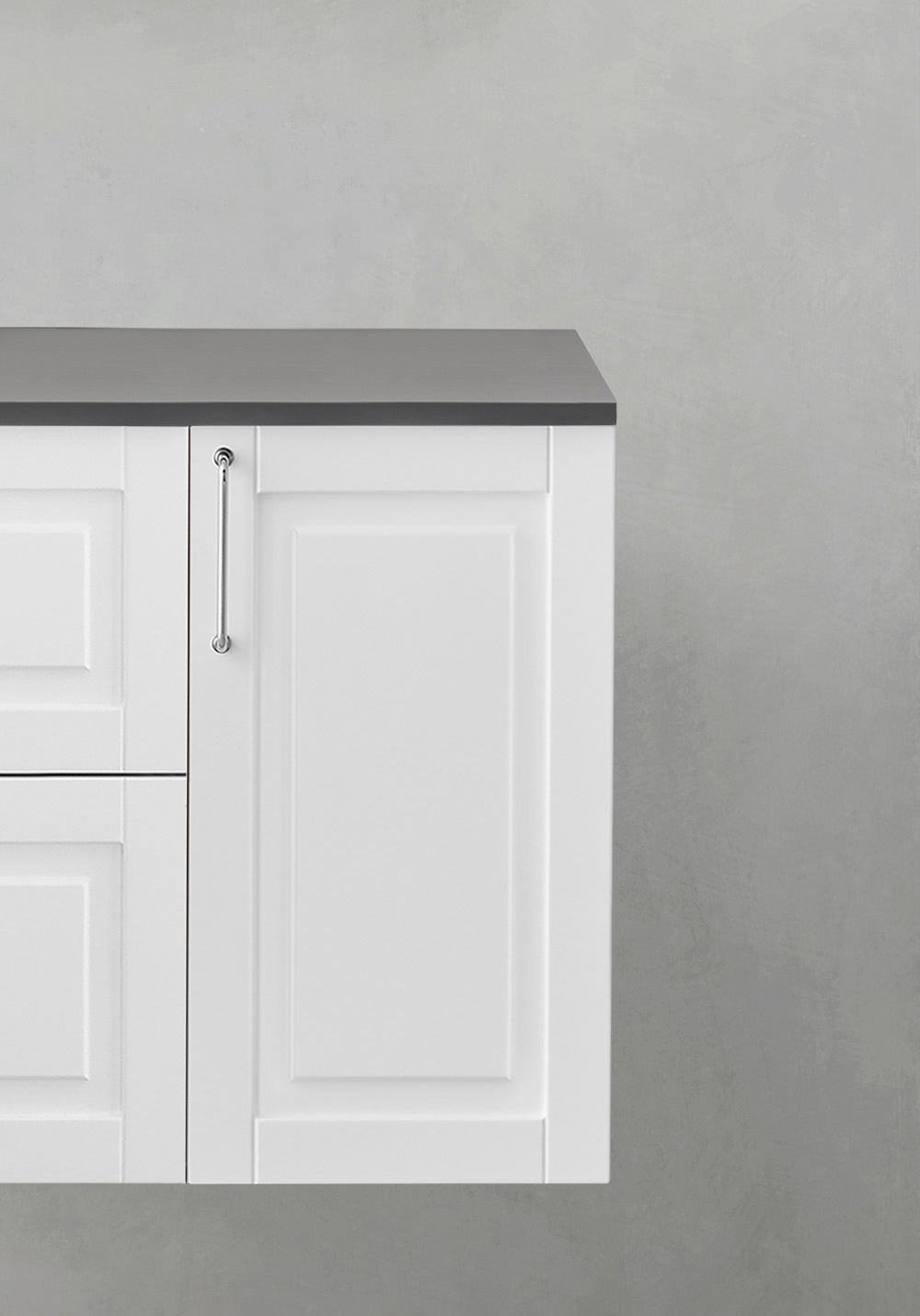Hafa Grace er baderomsmøbler med vakkert profilerte fronter designet for å passe inn i både et landlig og et moderne baderom i skandinavisk stil. Kompletter ditt servantskap med Hafa Grace sidemodul for ekstra bredde eller annen løsning. Velg mellom mykstengende dør som kompletteres med håndtak eller en dør som åpnes med push-open. Inne i skapet finnes en flyttbar hylle.