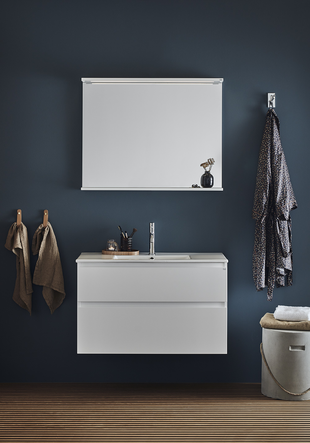 Hafa Style servantskap med servant har integrert håndtak, noe som gir møbelet et stilrent og moderne uttrykk. Servanten har en stor vask, og kommodens to skuffer med myk lukking har skuffematter og fullt uttrekk, slik at du enkelt kan nå alt som ligger i dem. Kjøp blandebatteri, bunnventil, vannlås, strømuttak. Hafa Style servantskap finnes i breddene 600, 800, 1000 og 1200 og i fargene hvit matt og vakkert mønstret eik eller brun eik. Baderomsskapet er enkelt å montere, med hel veggskinne og justerbare opphengsbeslag. Det er også forberedt for både vegg- og gulvavløp.