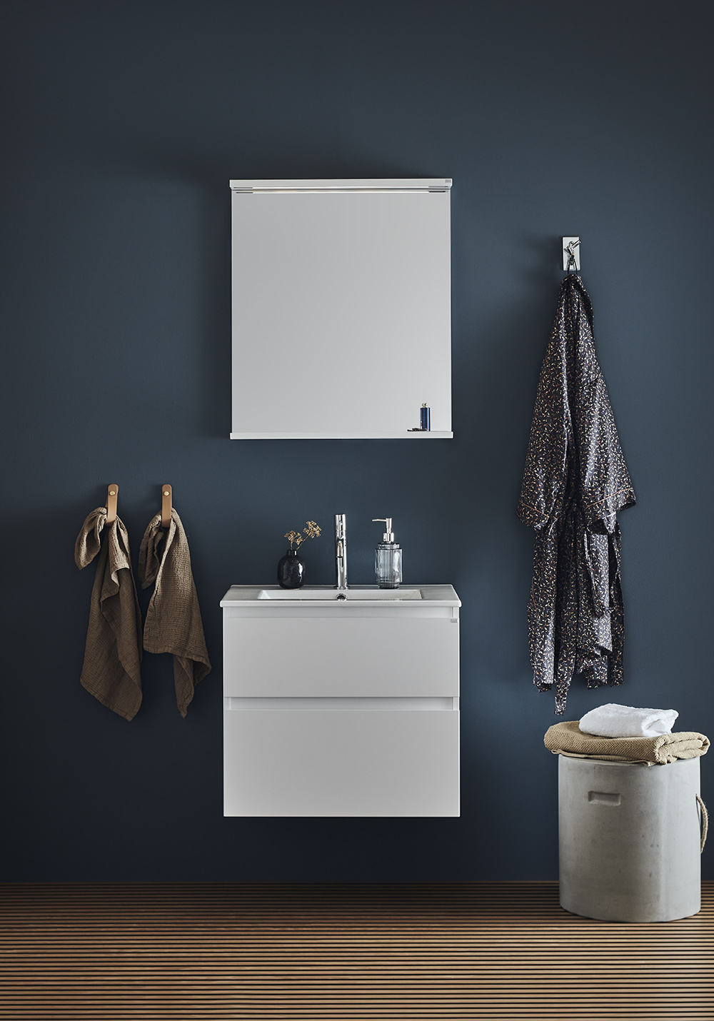Hafa Style servantskap med servant har integrert håndtak, noe som gir møbelet et stilrent og moderne uttrykk. Servanten har en stor vask, og kommodens to skuffer med myk lukking har skuffematter og fullt uttrekk, slik at du enkelt kan nå alt som ligger i dem. Kjøp blandebatteri, bunnventil, vannlås, strømuttak. Baderomsskapet er enkelt å montere, med hel veggskinne og justerbare opphengsbeslag. Det er også forberedt for både vegg- og gulvavløp.