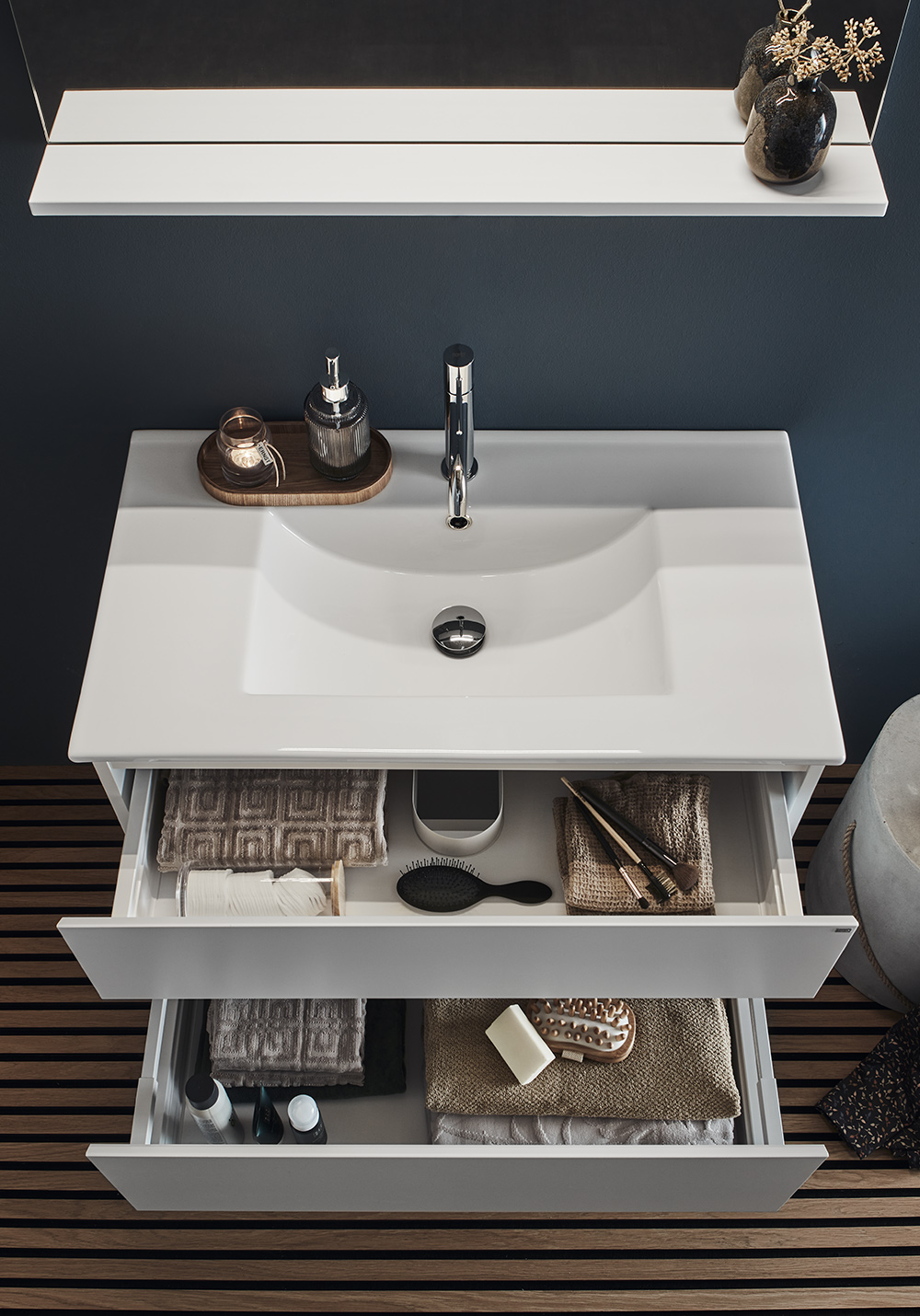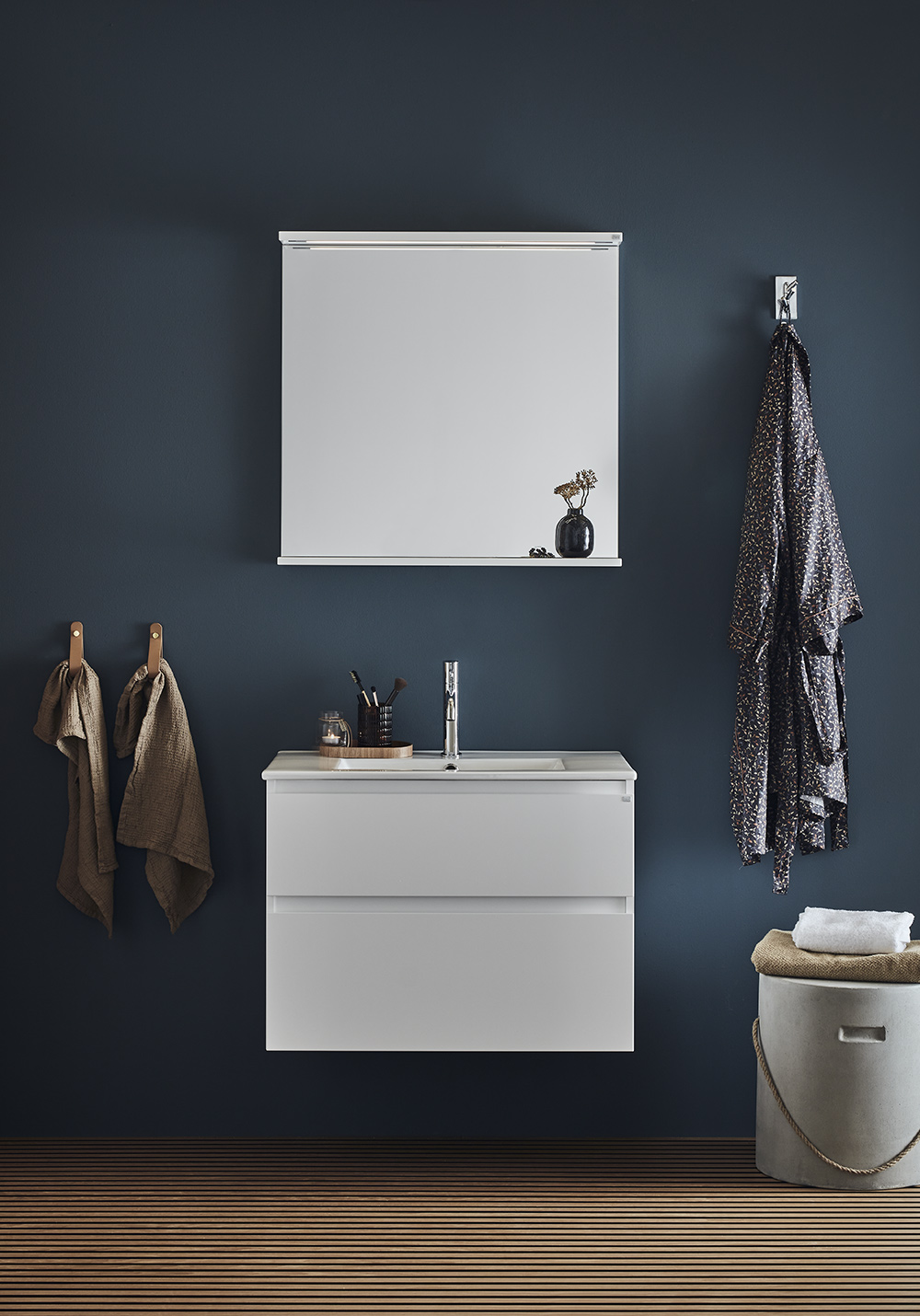 Hafa Style servantskap finnes i breddene 600, 800, 1000 og 1200 og i fargene hvit matt og vakkert mønstret eik eller brun eik. Baderomsskapet er enkelt å montere, med hel veggskinne og justerbare opphengsbeslag. Det er også forberedt for både vegg- og gulvavløp.