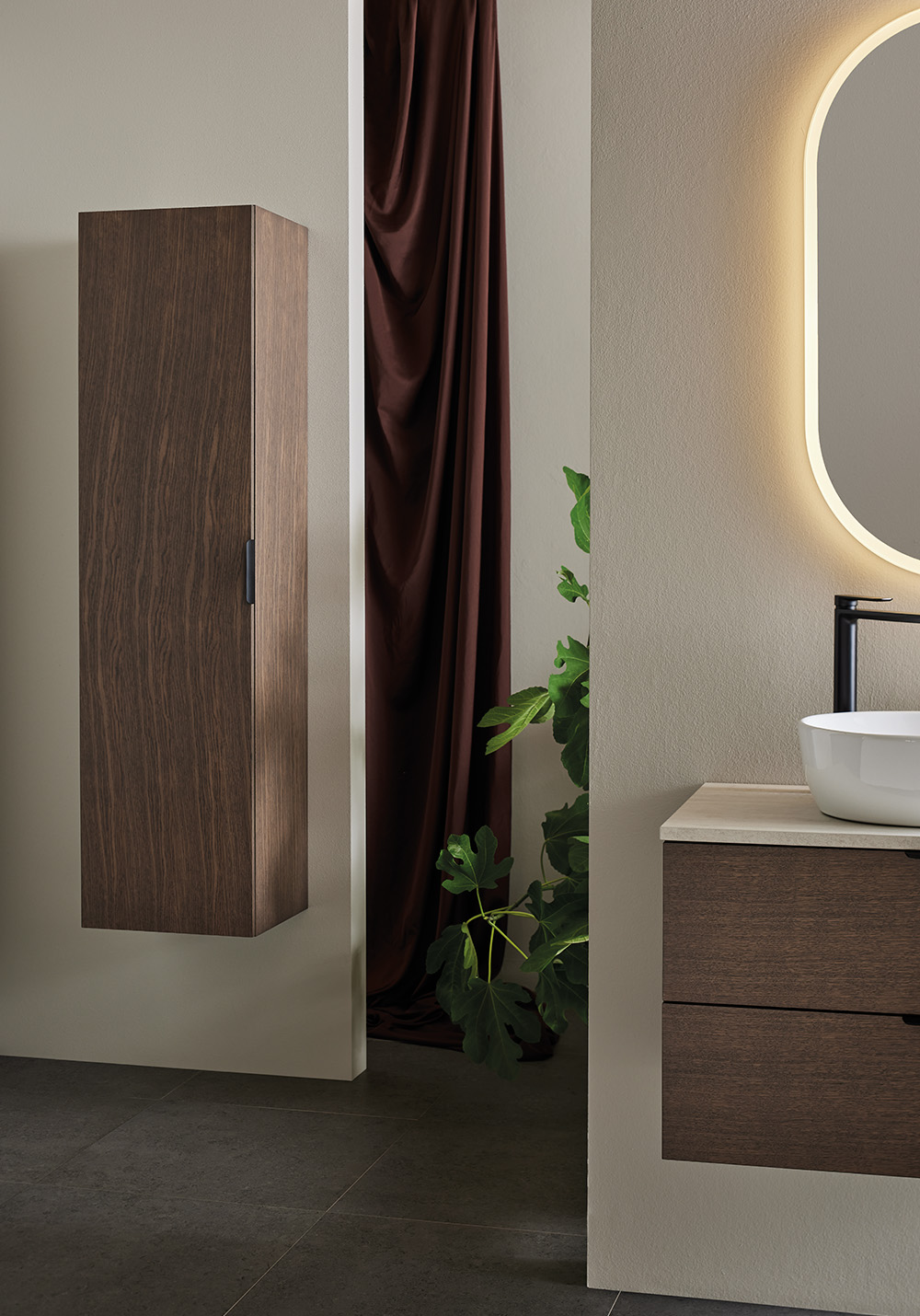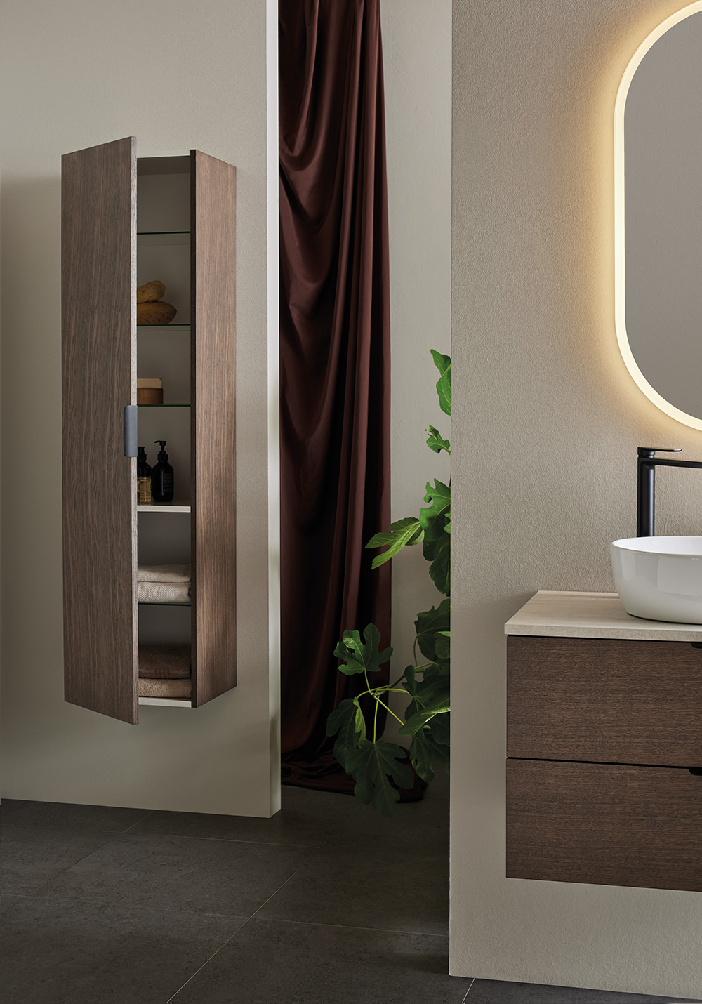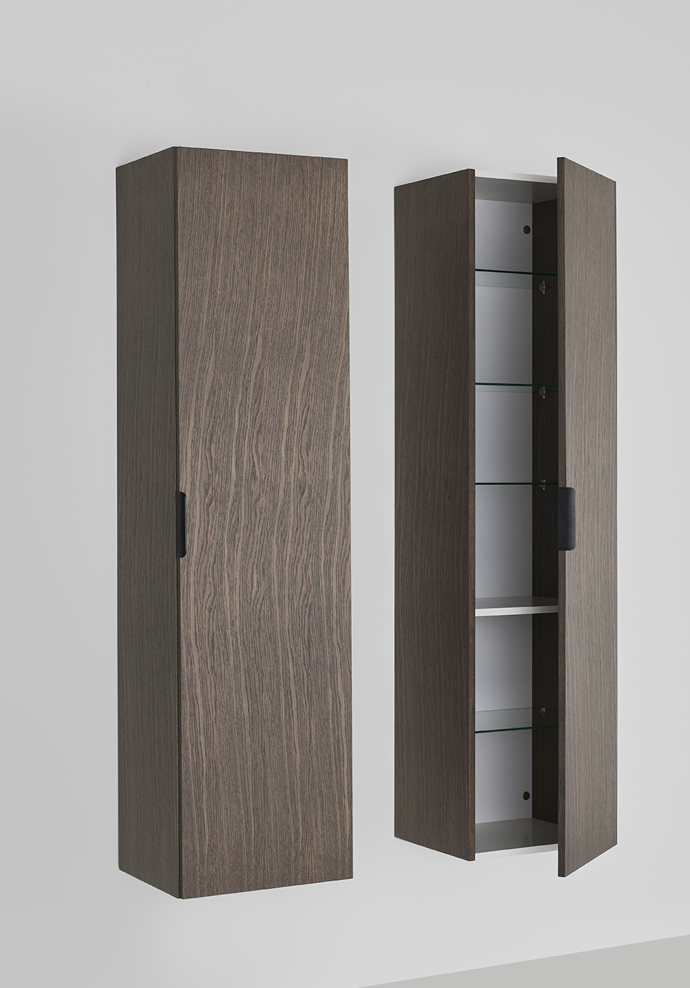 Højskab i finér med rummelige mål og med blødlukkende låge. Inde i skabet er der fire glashylder der er justerbare i højden og hyldebærer, der fastgør i højden og en fast hylde. Skabet er færdigsamlet og monteres nemt på en skinne på væggen. Lågen kan monteres i højre eller venstre side. Køb til håndtag og stikkontakter 126 72 65.