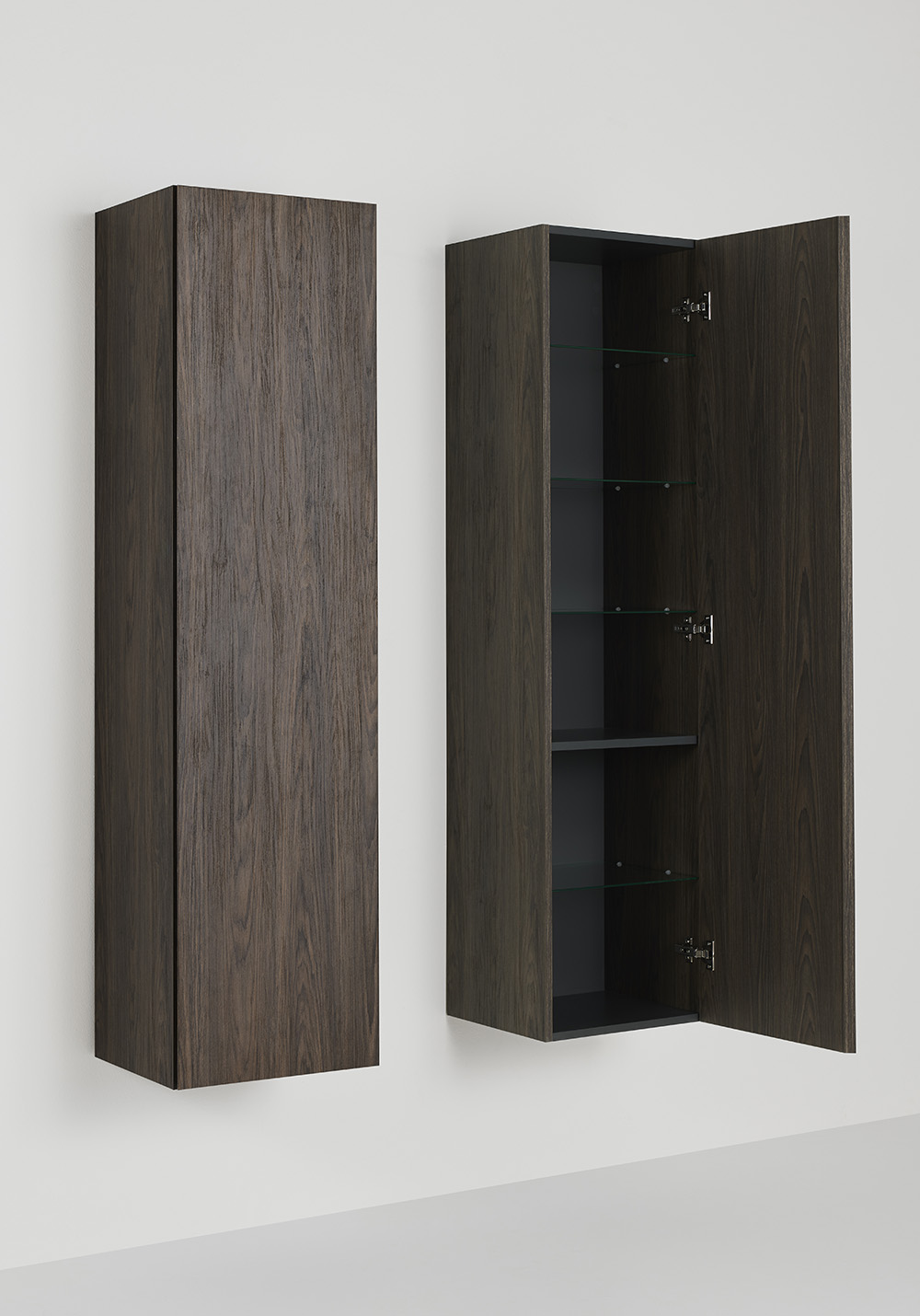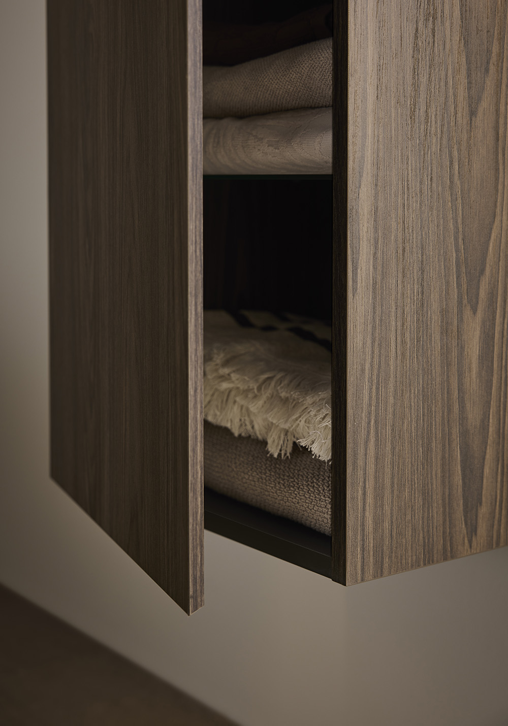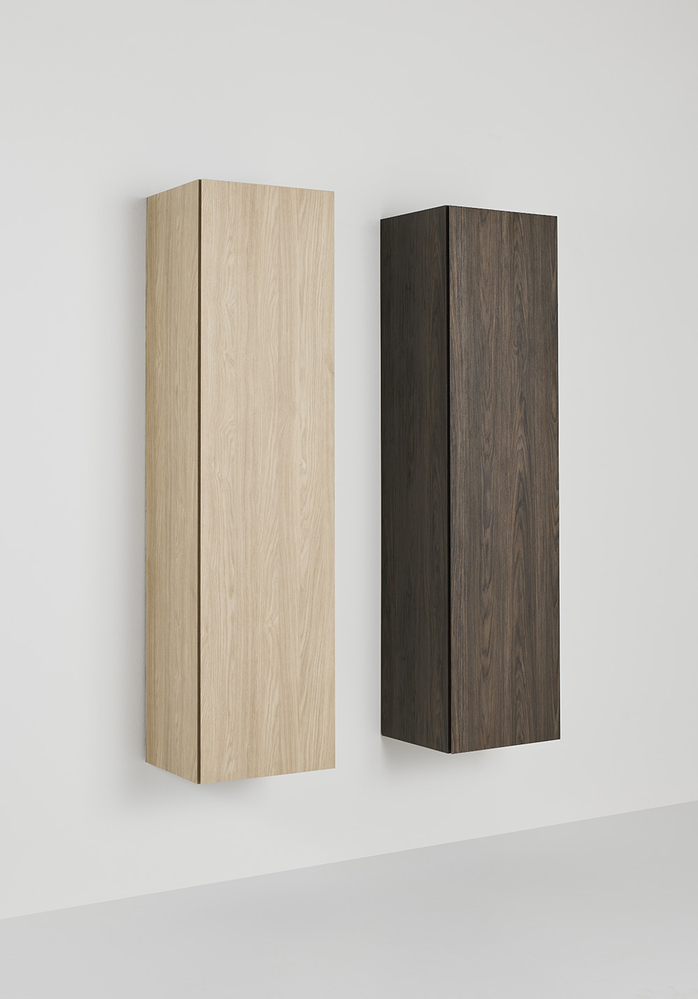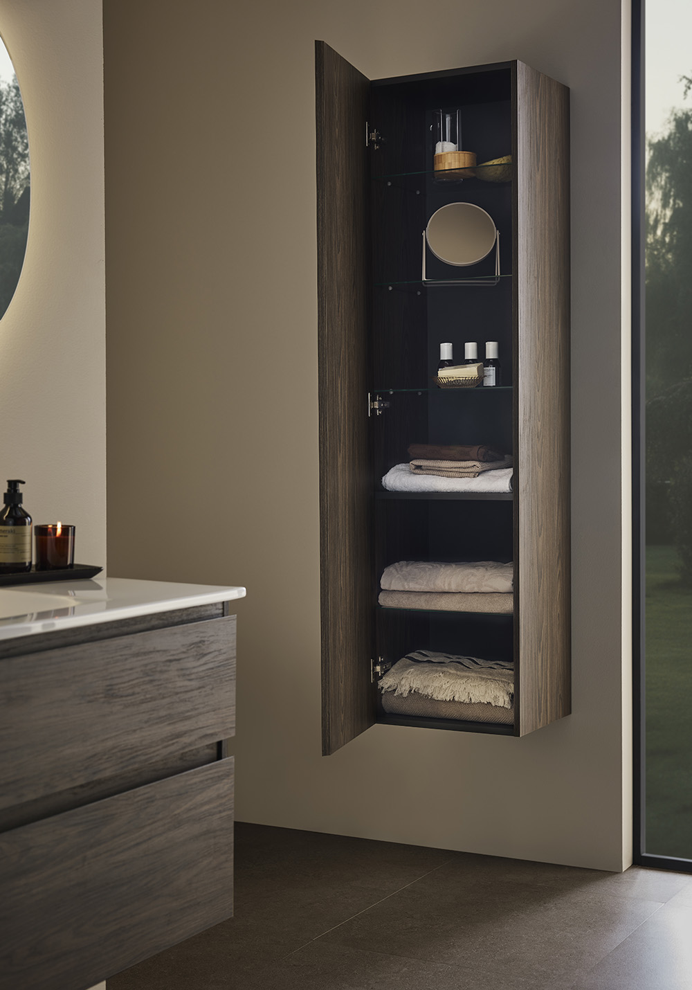 Høyskap Hafa Style med mønstret overflate av brun eik og integrert håndtak gir møbelet et stilrent og moderne uttrykk. Skapet er romslig og tilpasset for brettede badehåndklær.