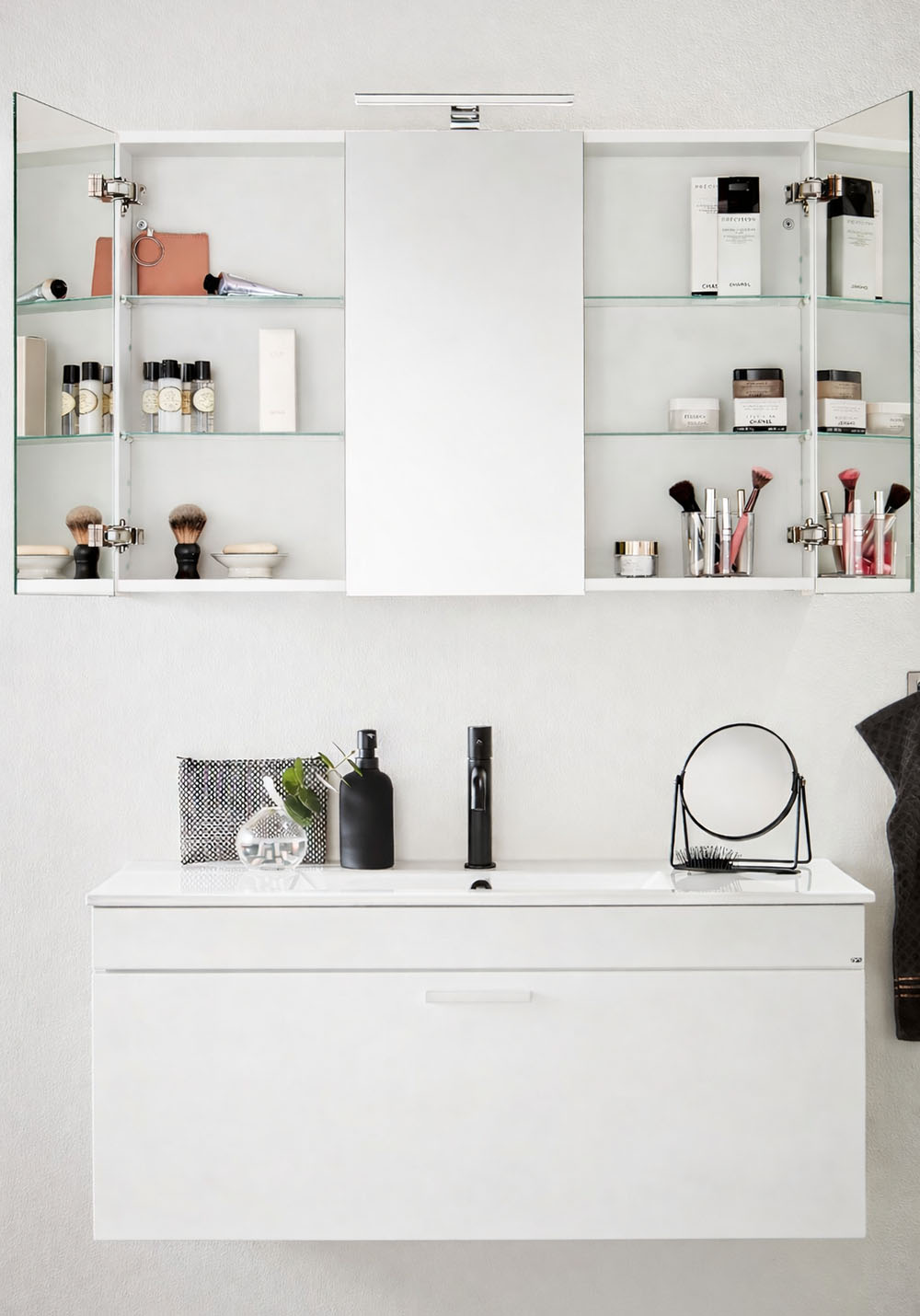 Hafa Go speilskap er et praktisk skap med god plass til oppbevaring. Med dobbeltsidige speildører og glasshyller inni som kan flyttes vertikalt. Speilskapet monteres enkelt opp på en skinne på veggen, noe som gjør det enkelt å montere for en person. Med justerbare opphengsbeslag. Finnes i flere bredder og farger. Kjøp til Go LED-lampe 1267270 og stikkontakt 1267265.