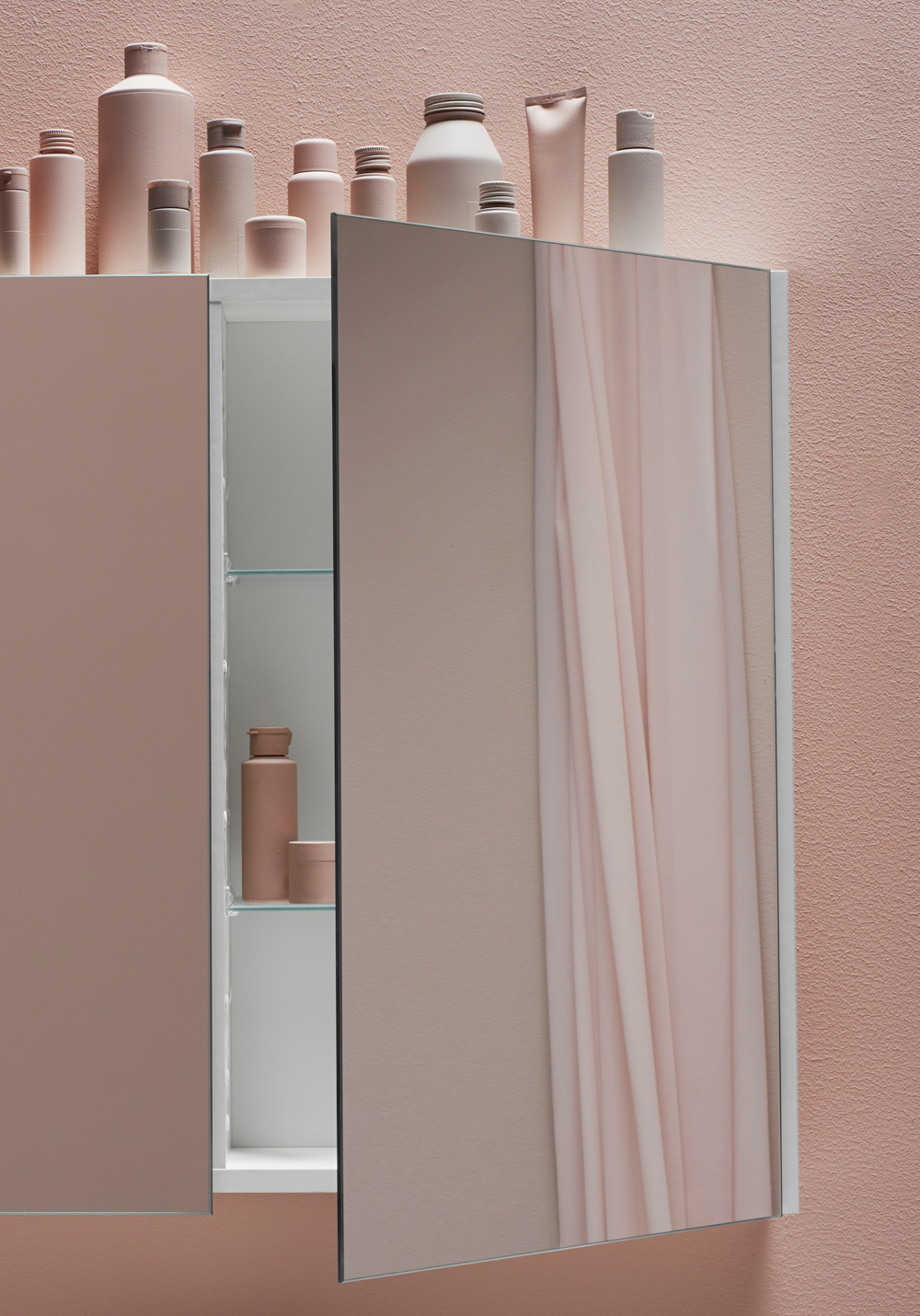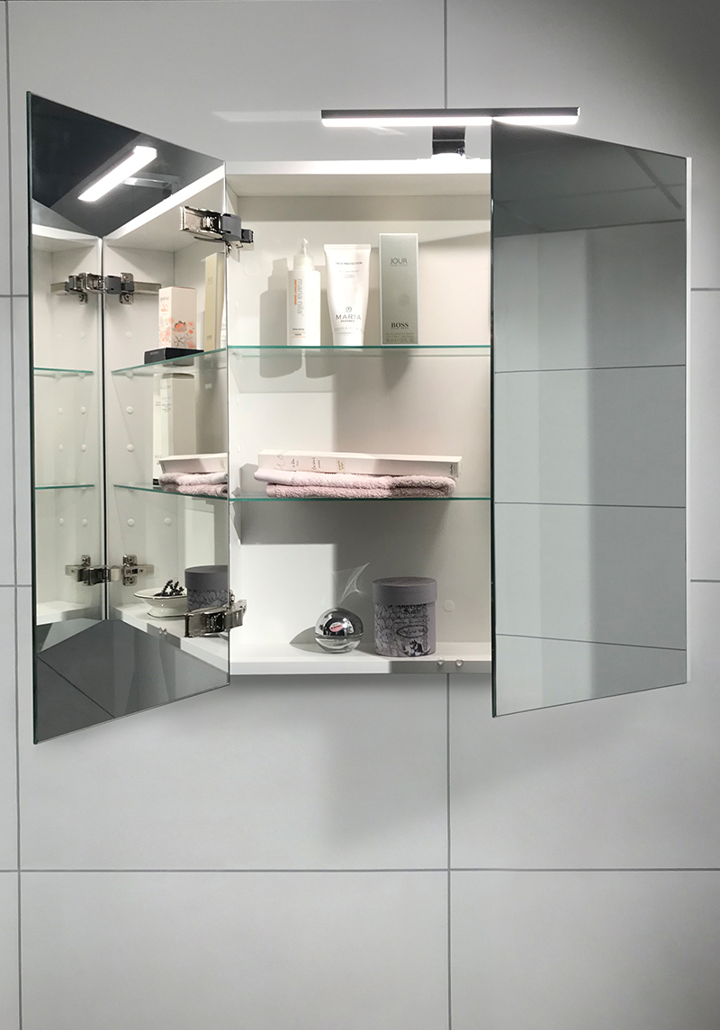 - Speilskap med dobbeltsidige speil og 2 justerbare hyller i klart glass