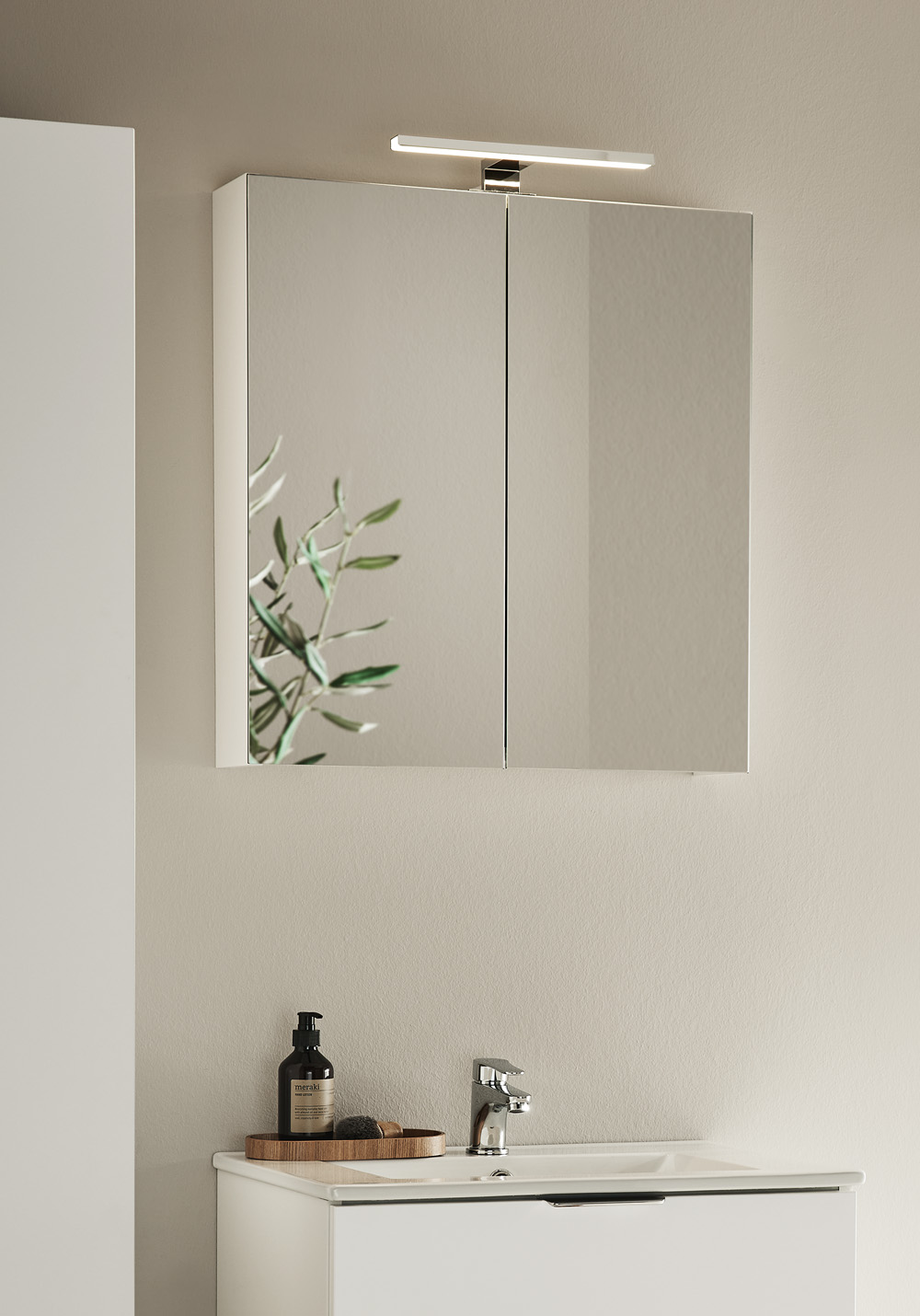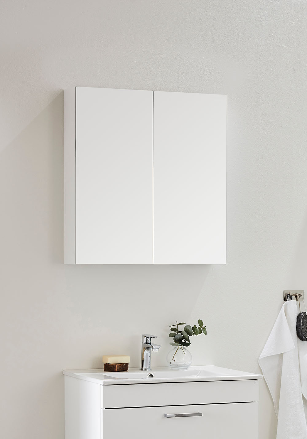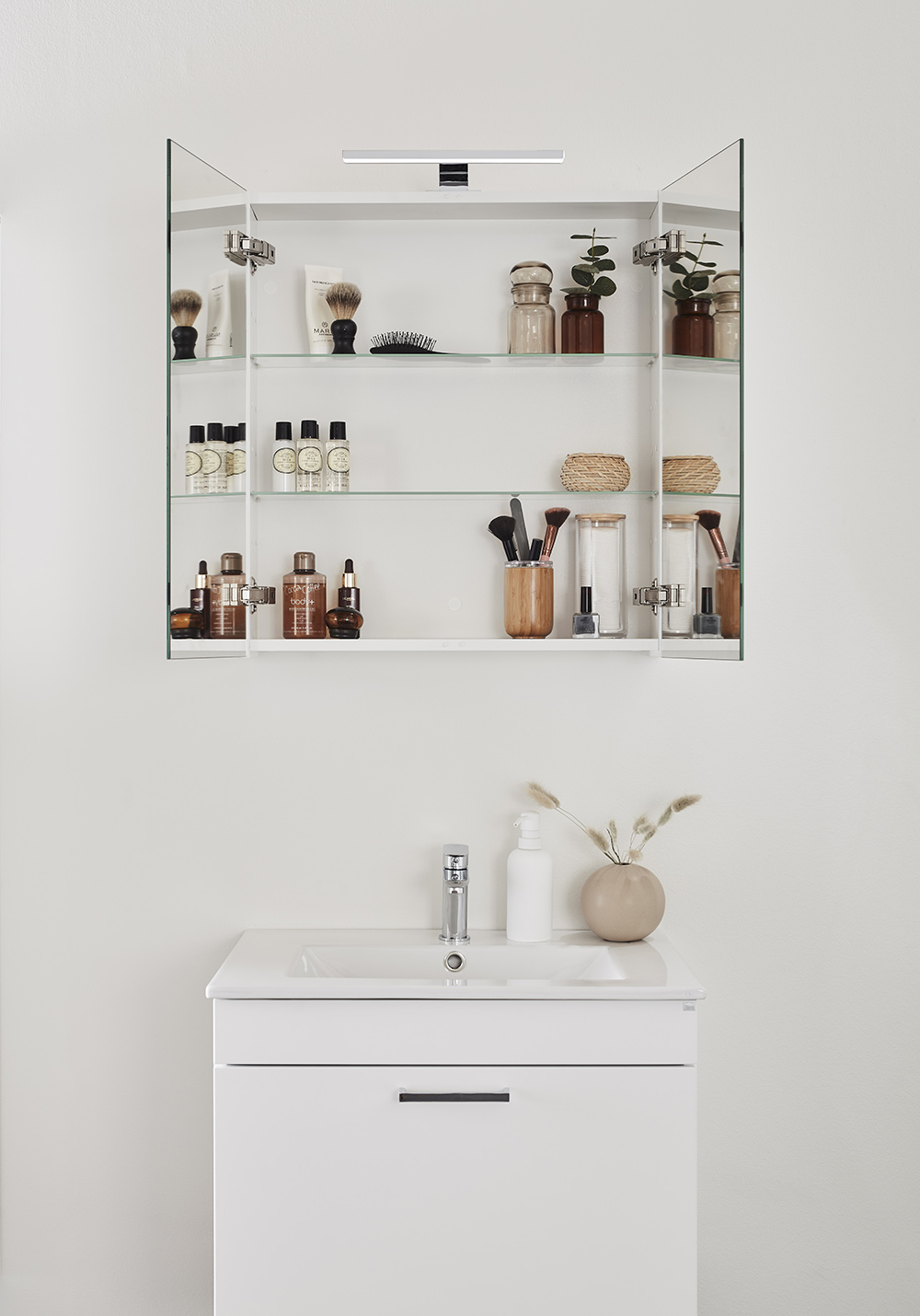 Hafa Go speilskap er et praktisk skap med god plass til oppbevaring. Med dobbeltsidige speildører og glasshyller inni som kan flyttes vertikalt. Speilskapet monteres enkelt opp på en skinne på veggen, noe som gjør det enkelt å montere for en person. Med justerbare opphengsbeslag. Finnes i flere bredder og farger. Kjøp til Go LED-lampe 1267270 og stikkontakt 1267265.