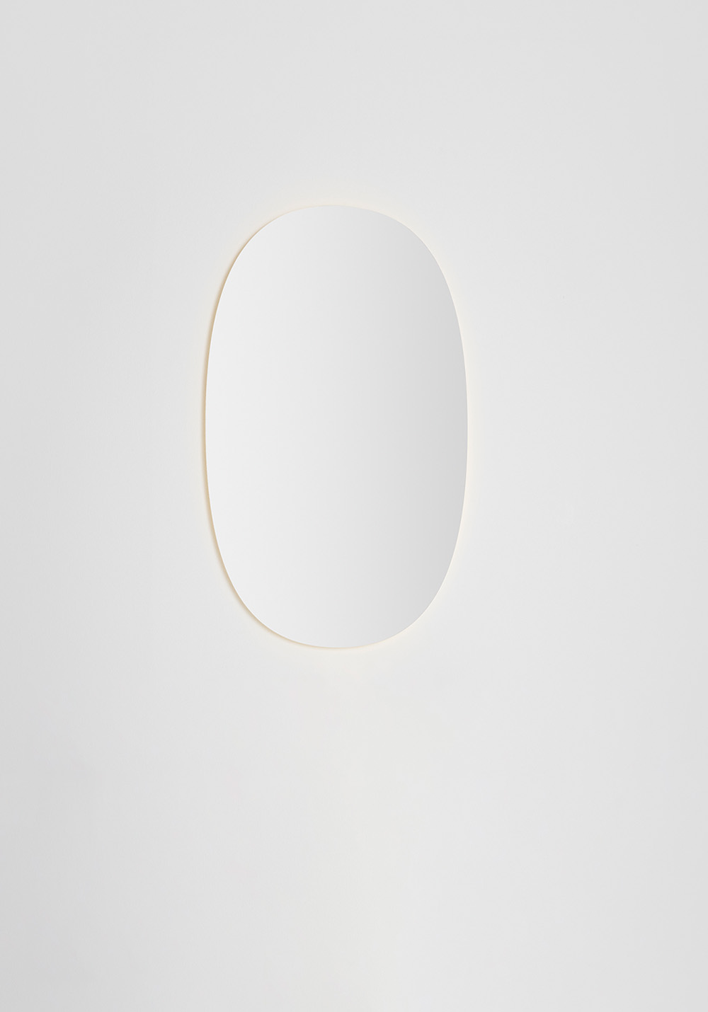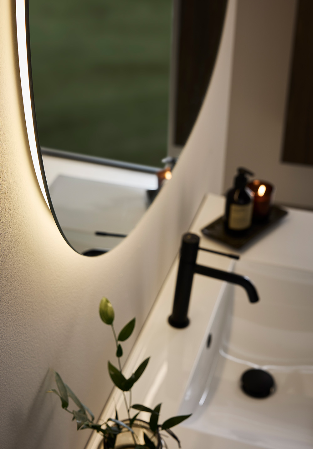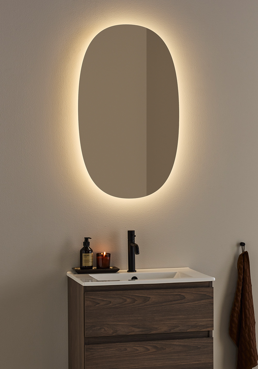Med elegante former og behagelig lys skaper Hafa Ellipse-speilet en sofistikert atmosfære på badet. Speilet er elegant bakgrunnsbelyst med varmt hvitt lys og har en nøye gjennomtenkt design som sprer lyset mykt utover.