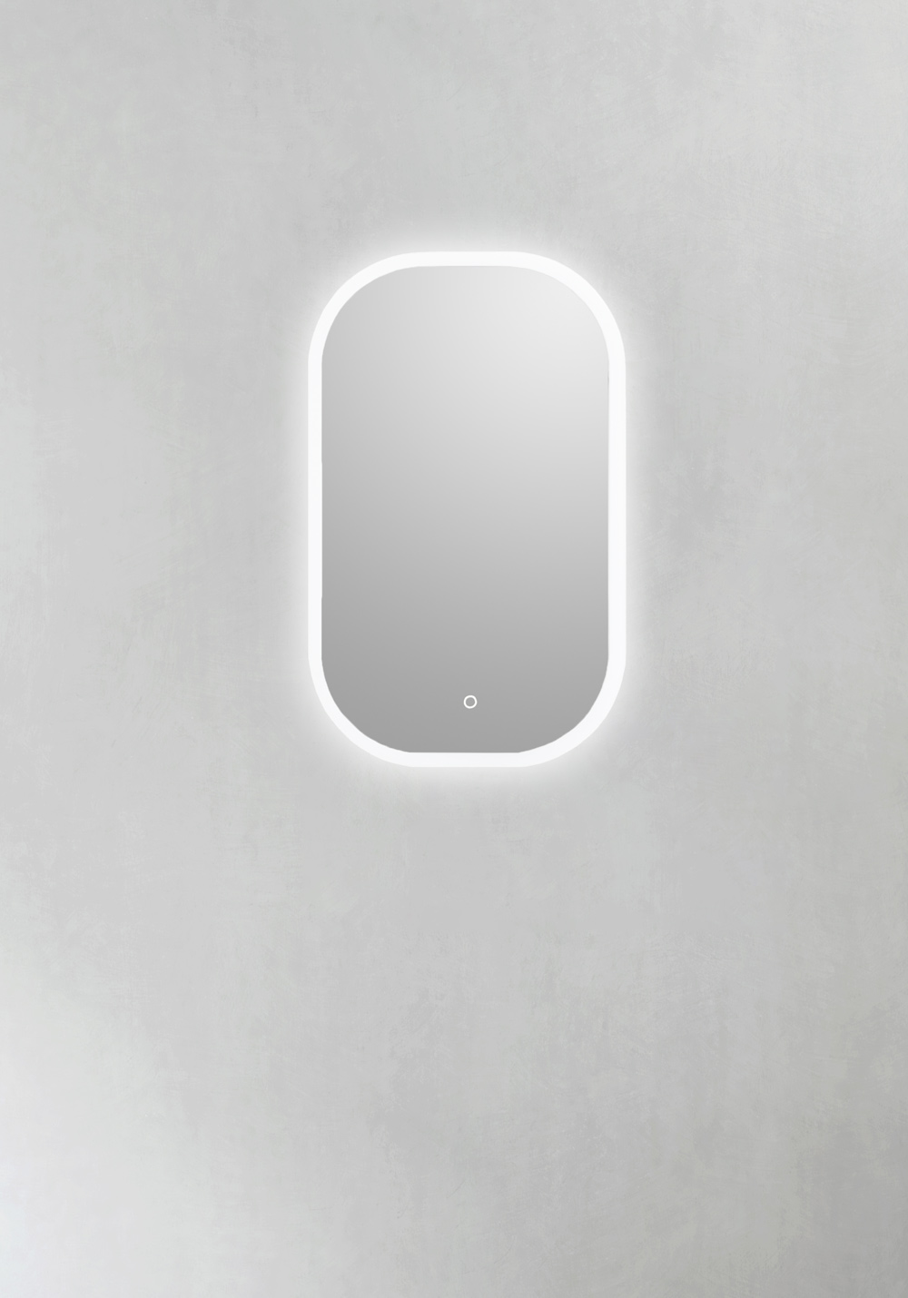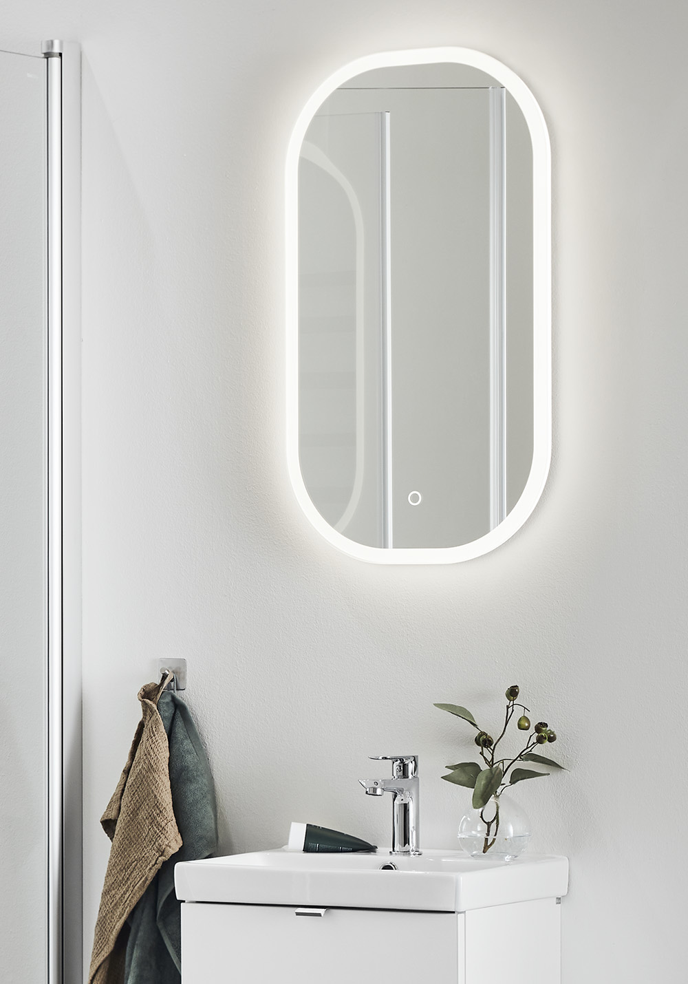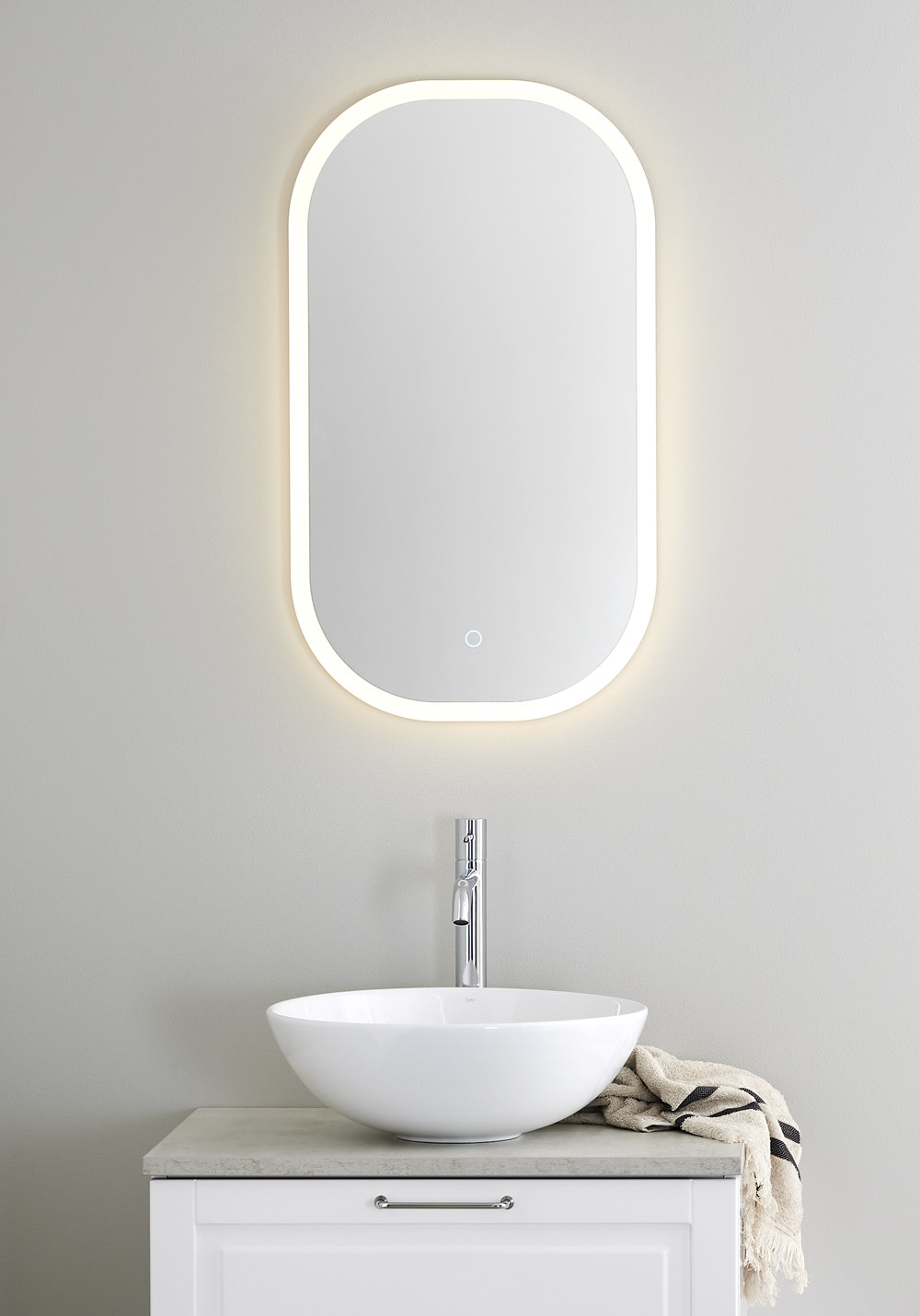 Mykt avrundet speil med dimbar belysning rundt. Dekorativ og funksjonell LED-belysning med varmhvitt lys som styres med touchfunksjon. Speilet husker den siste lysinnstillingen ved på/av. IP44.