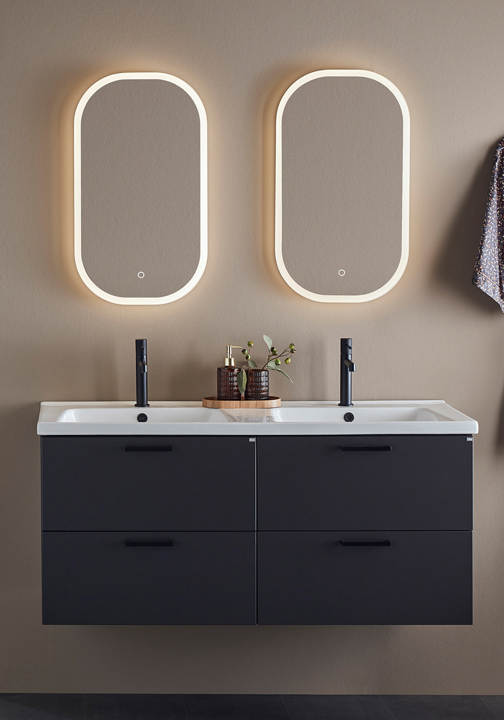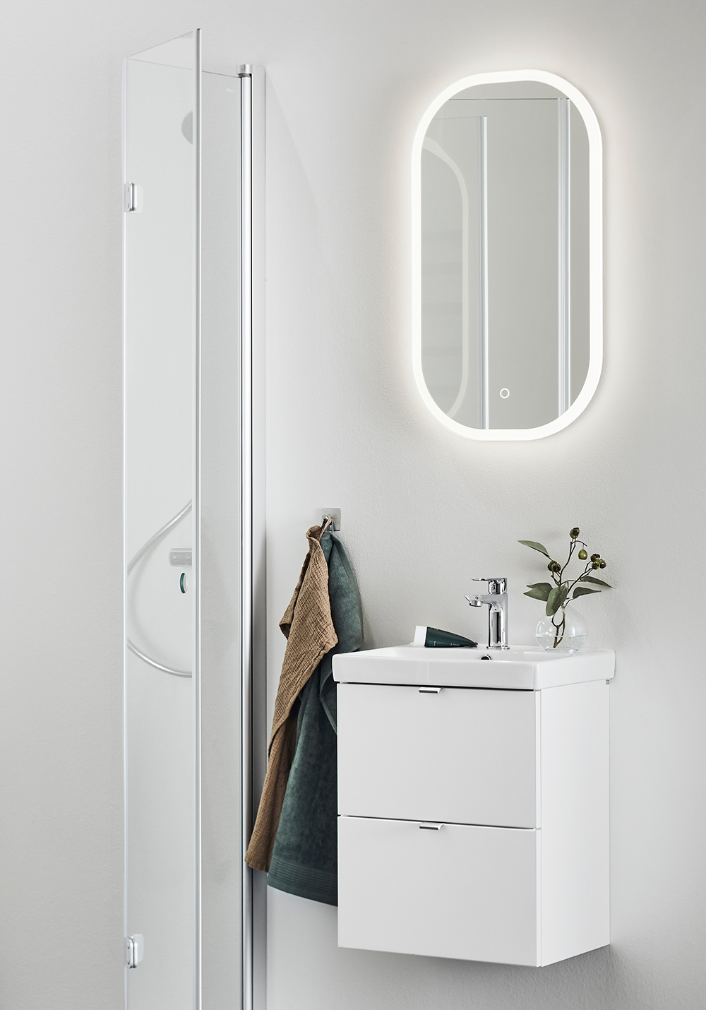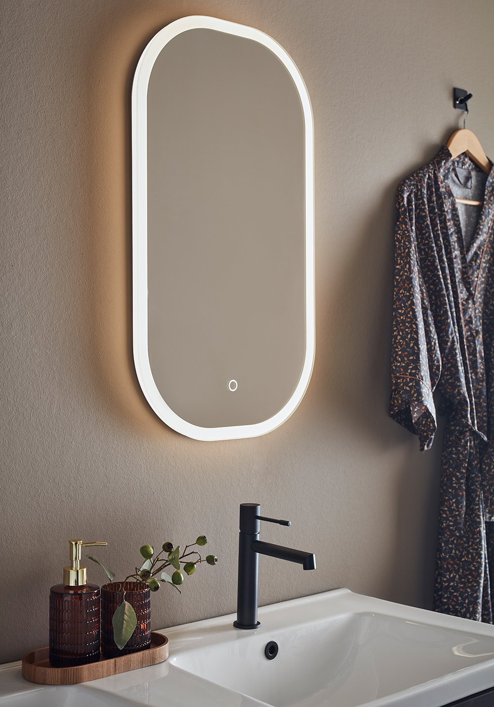 Mykt avrundet speil med dimbar belysning rundt. Dekorativ og funksjonell LED-belysning med varmhvitt lys som styres med touchfunksjon. Speilet husker den siste lysinnstillingen ved på/av. IP44.