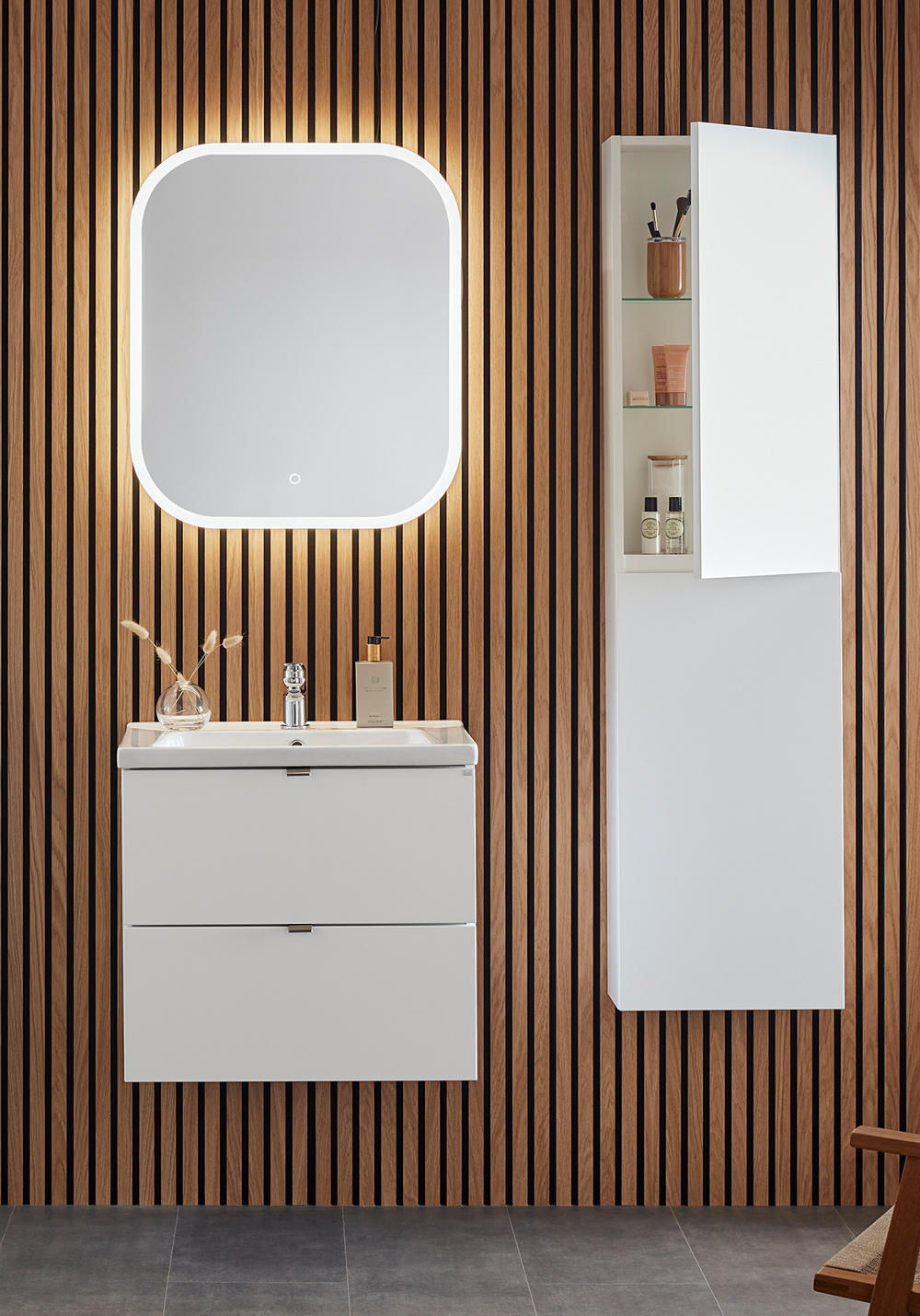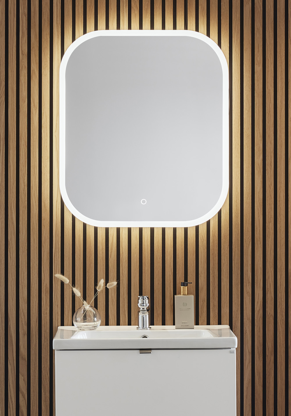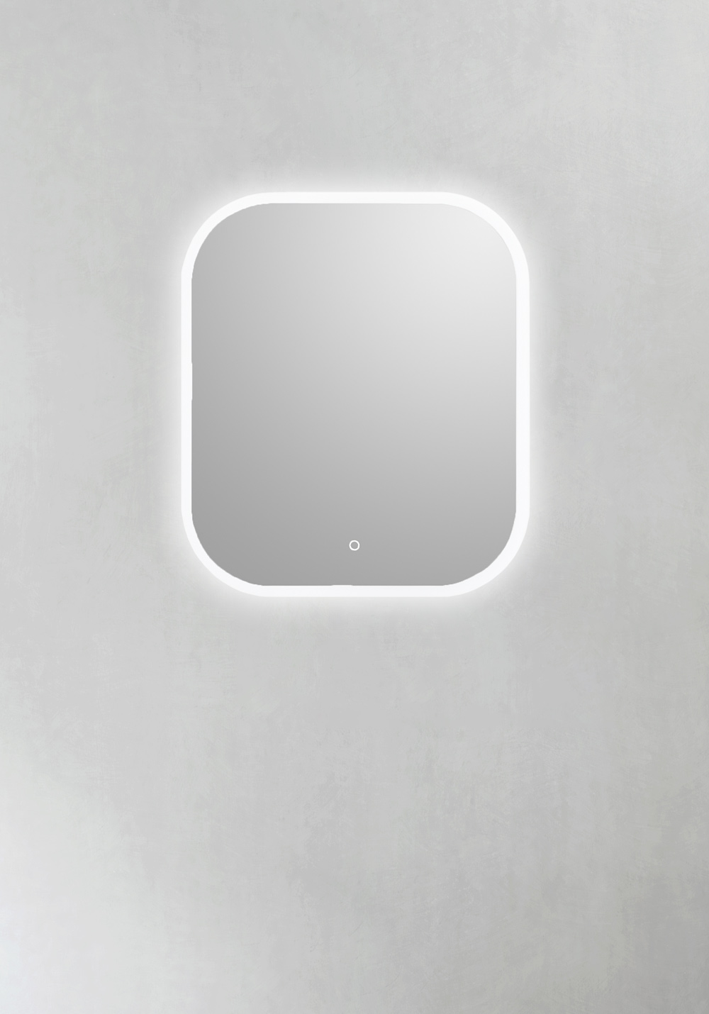 Mykt avrundet speil med dimbar belysning rundt. Dekorativ og funksjonell LED-belysning med varmhvitt lys som styres med touchfunksjon. Speilet husker den siste lysinnstillingen ved på/av. IP44.