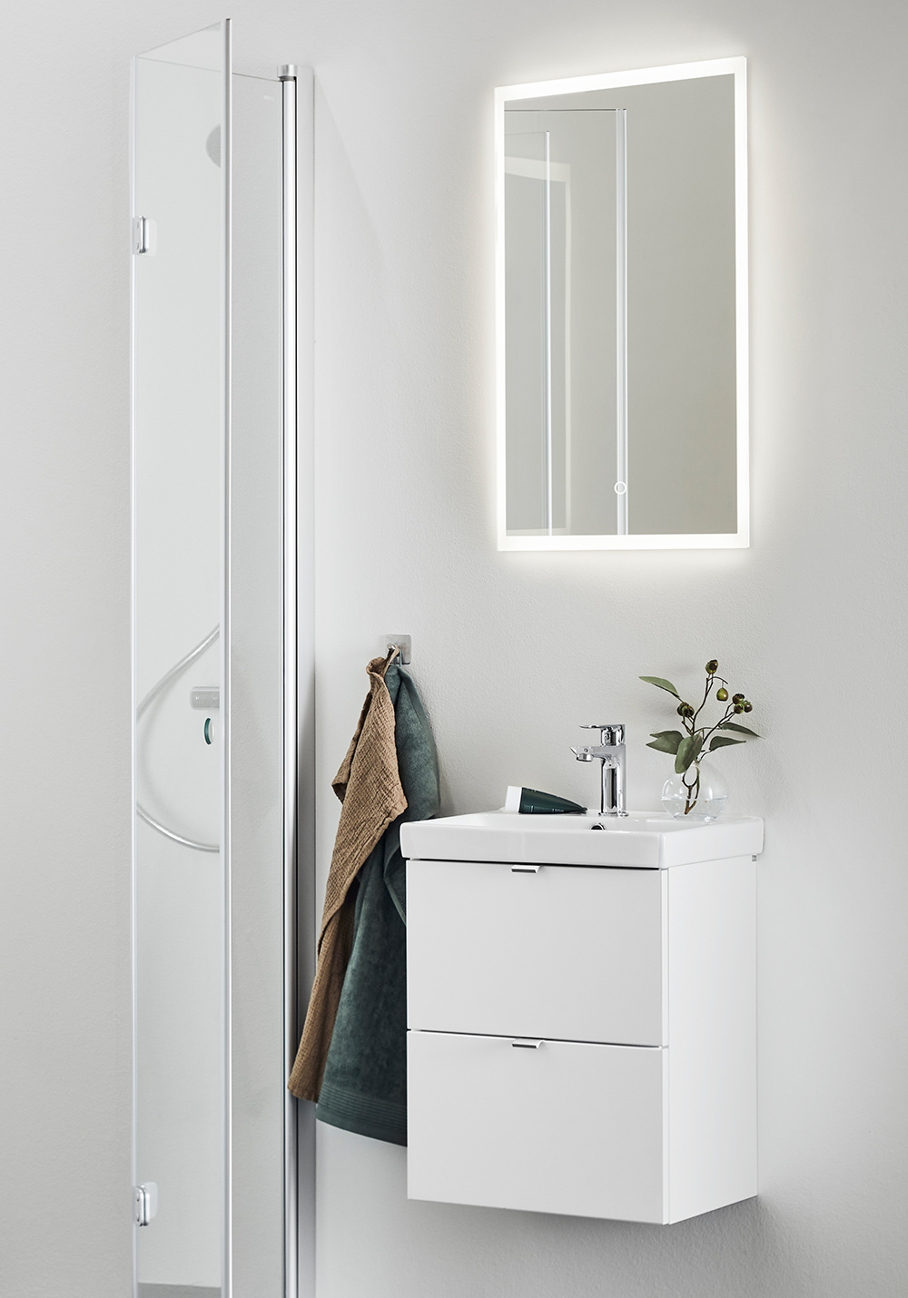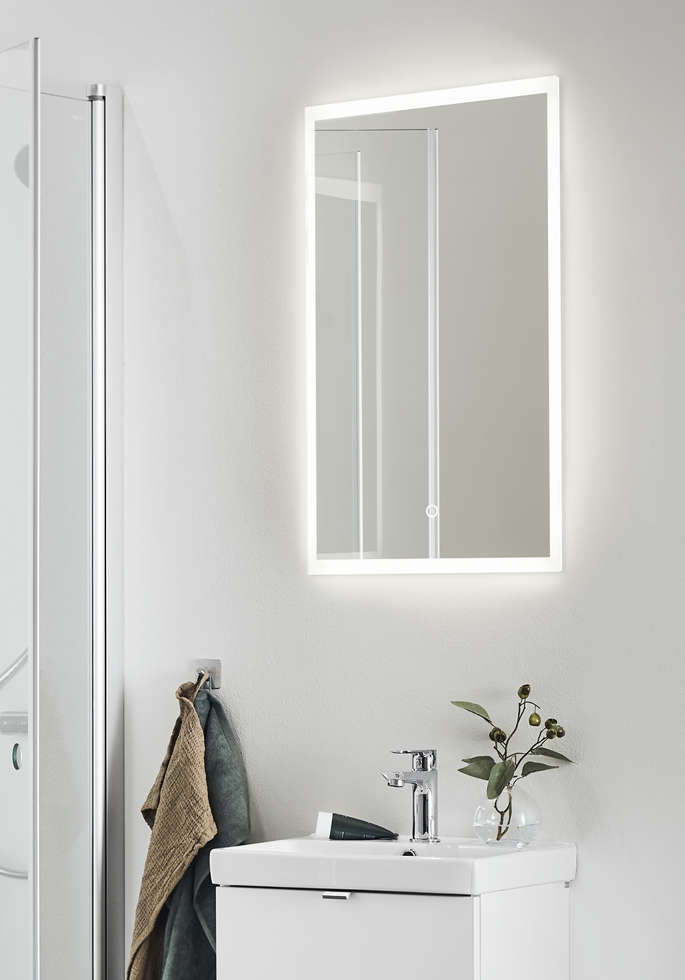 Stilrent rektangulært speil med dimbar belysning rundt. Dekorativ og funksjonell LED-belysning med varmhvitt lys som styres med touchfunksjon. Speilet husker den siste lysinnstillingen ved på/av. IP44.