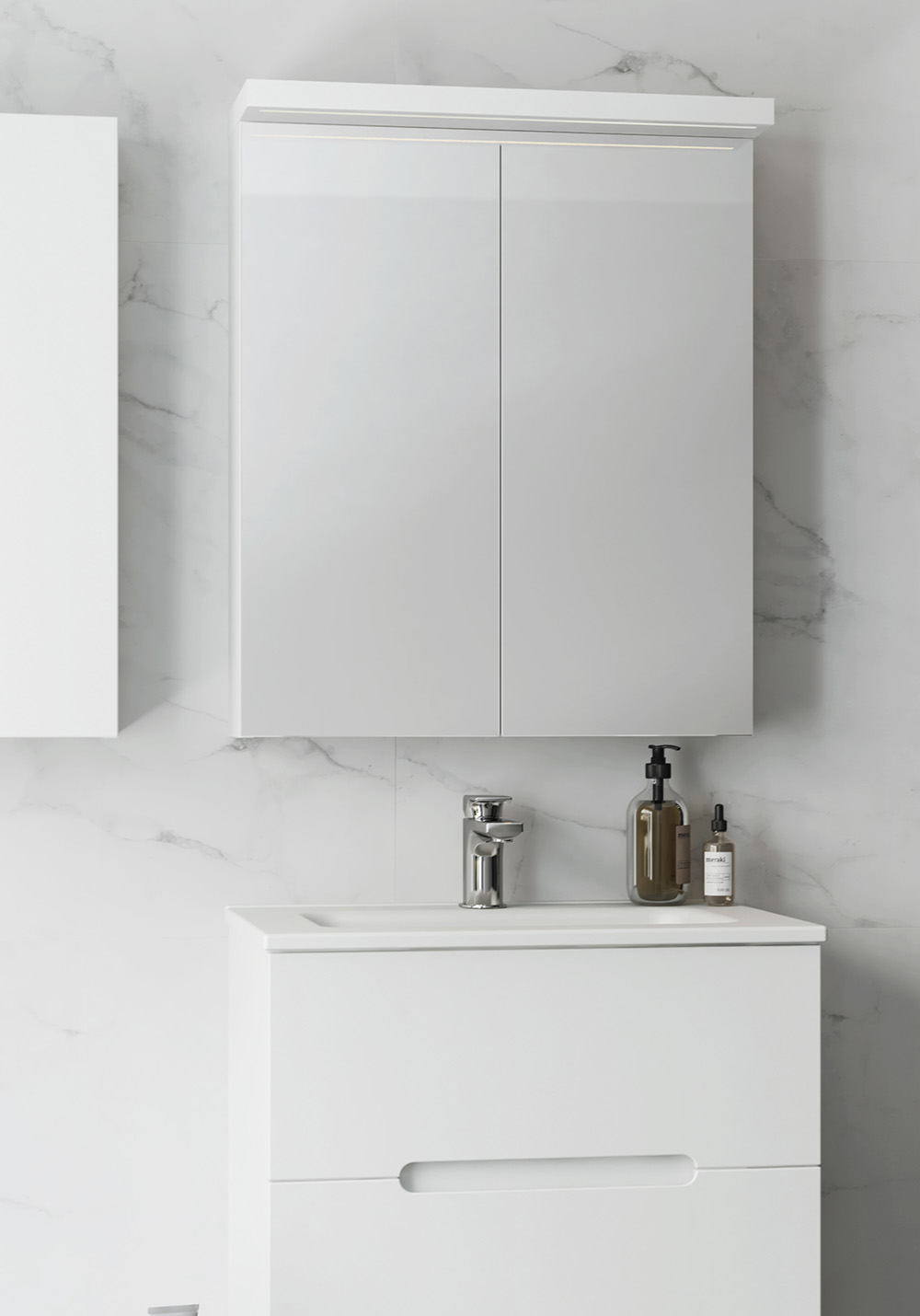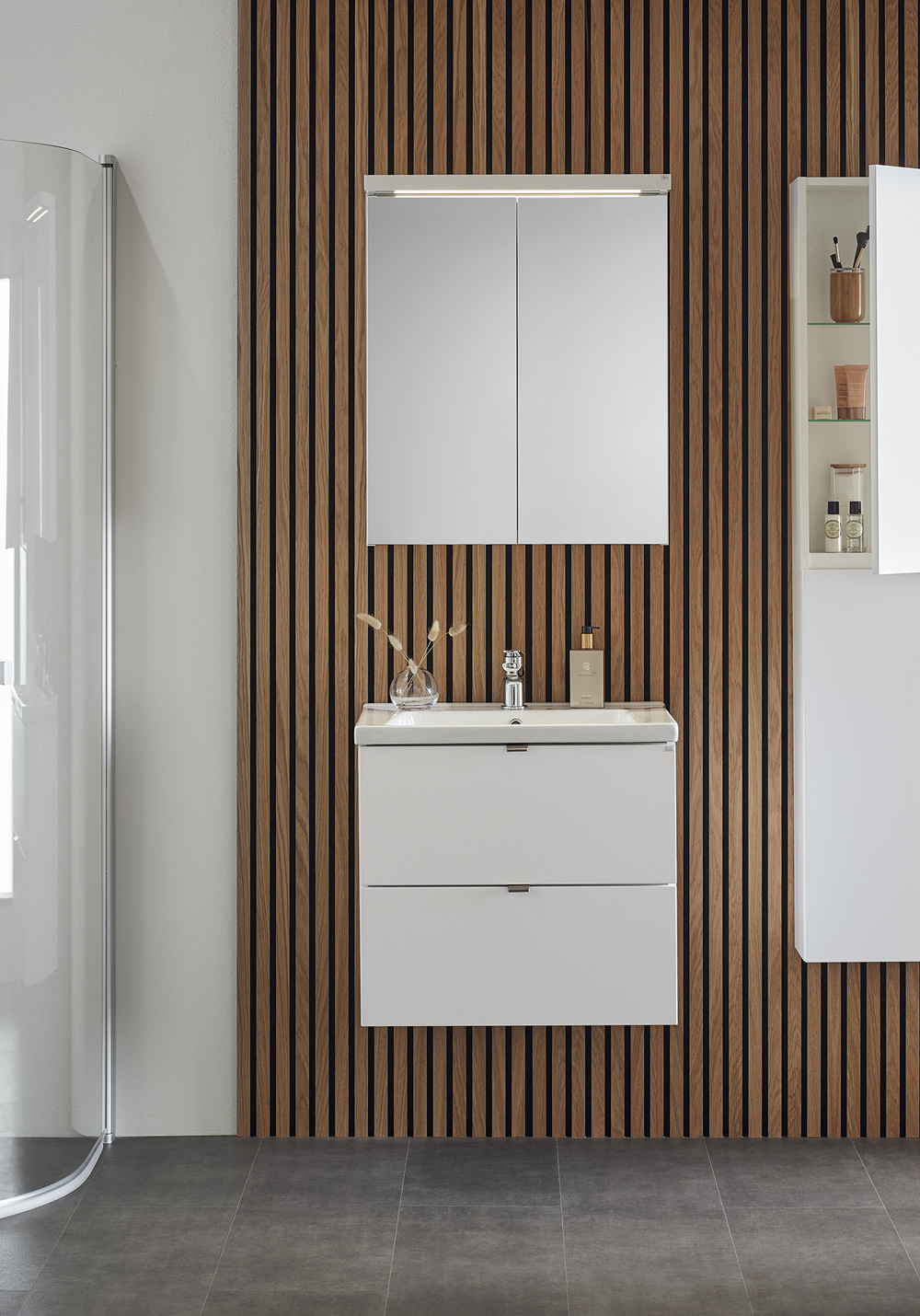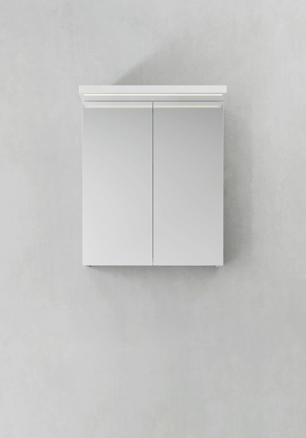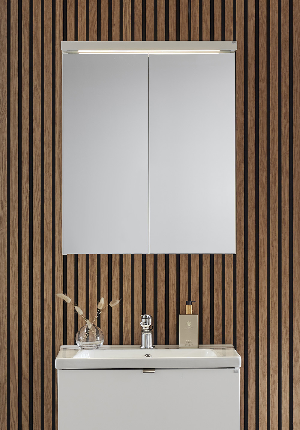 Speilskap med funksjonell belysning med innfelt LED-profil eller LED-spotter i varmhvitt lys. Myktlukkende, dobbeltsidige speildører. Strømuttak innvendig på høyre side og flyttbare hyller i glass med hyllebærere som låser dem sikkert på plass. Enkel installasjon for en person med hel opphengsskinne og justerbare opphengsbeslag. Forberedt for enkel el-installasjon. IP44.