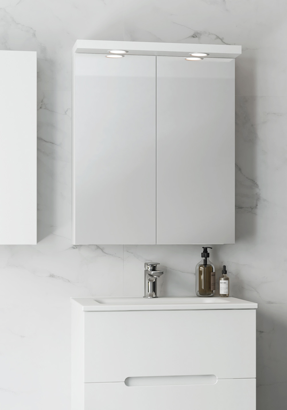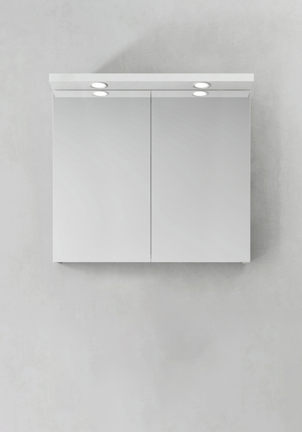 Speilskap med funksjonell belysning med innfelt LED-profil eller LED-spotter i varmhvitt lys. Myktlukkende, dobbeltsidige speildører. Strømuttak innvendig på høyre side og flyttbare hyller i glass med hyllebærere som låser dem sikkert på plass. Enkel installasjon for en person med hel opphengsskinne og justerbare opphengsbeslag. Forberedt for enkel el-installasjon. IP44.
