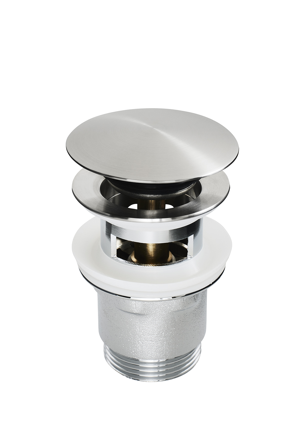 Bunnventil pop-up av rustfritt stål med stort fjærbelastet lokk med børstet overflate. Til servant med overløp.