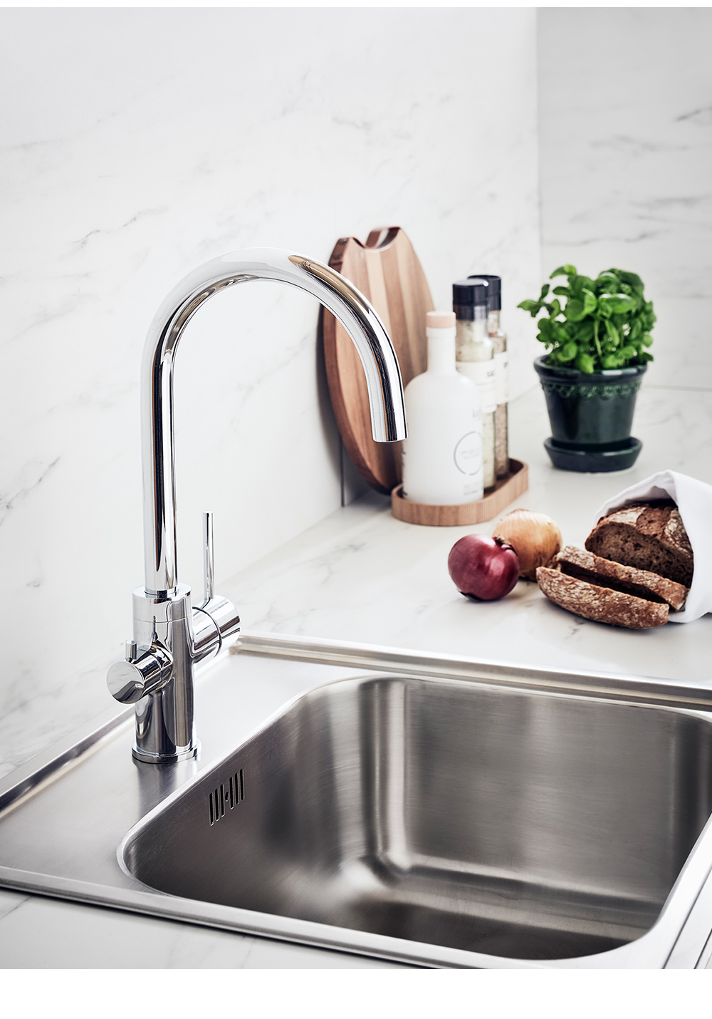 Elegant kjøkkenbatteri laget av messing i krom utførelse. Med avstenging for oppvaskmaskin, svingbar tut samt svingradius på 70°, 110° eller uten (360°). Testet og sertifisert av SINTEF.