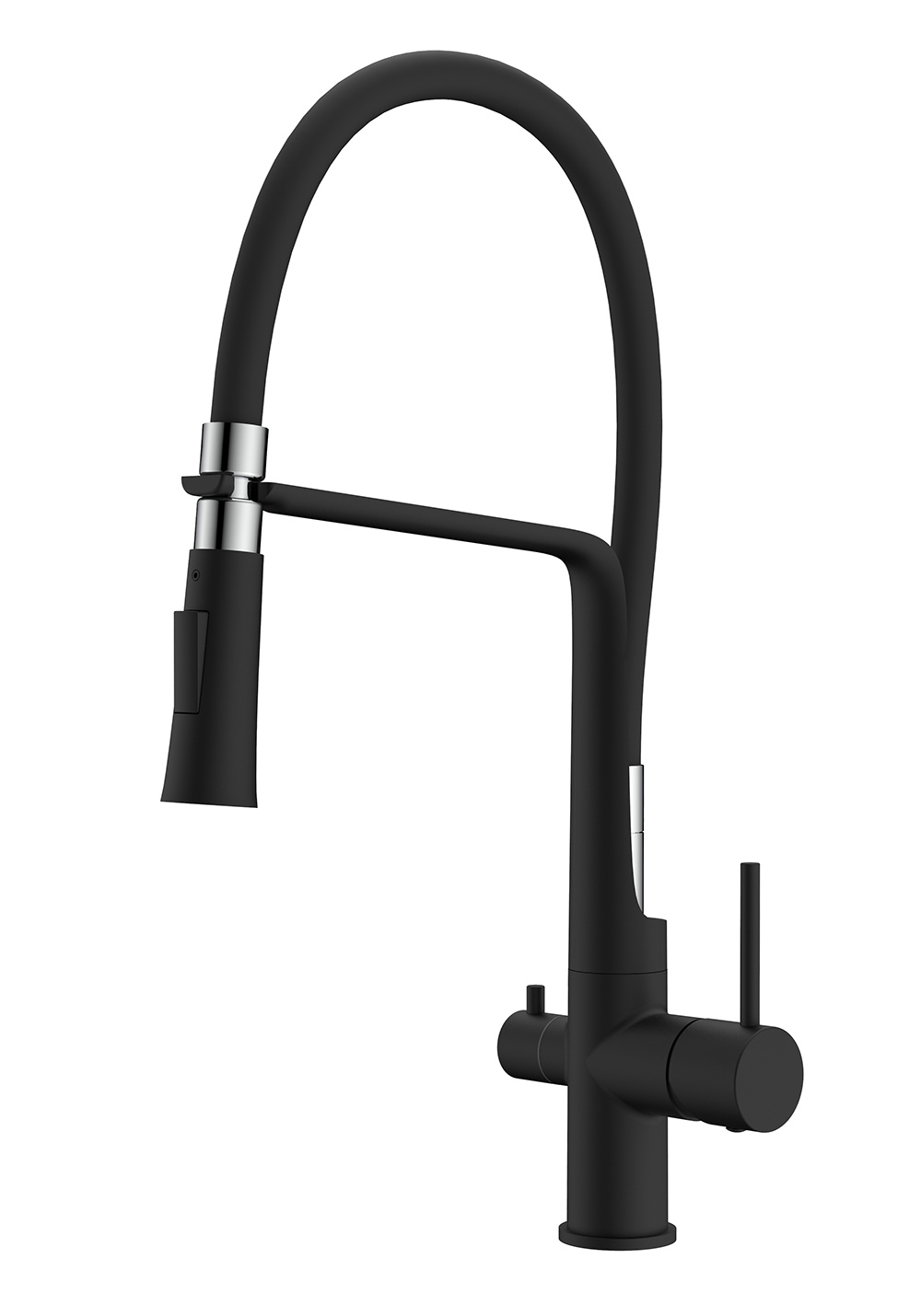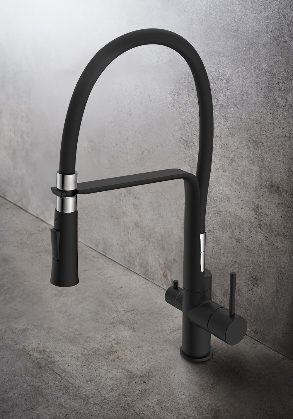 Praktisk kjøkkenbatteri i organiske former av messing i svart matt lakk utførelse med avtagbart munnstykke. Med avstenging for oppvaskmaskin samt svingradius på 110°. Testet og sertifisert av SINTEF.