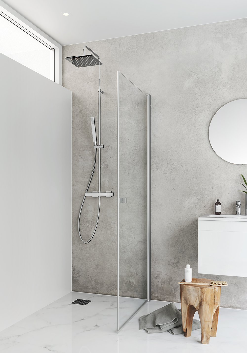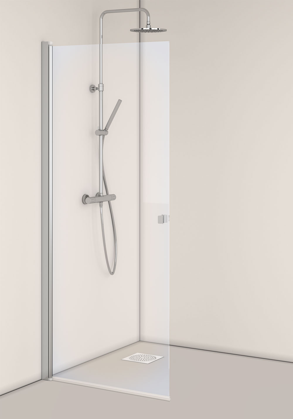 Rett dusjdør med klart glass i svart matt eller aluminium som passer det mindre baderommet fordi den kan foldes inn når den ikke er i bruk. Dusjdøren er stabil med en veggprofil i aluminium som kan monteres med skruer eller limbrikker. Den har en patentert løsning for enkel installasjon og justering, Hafa's InstaQuick™. Dusjdøren har løftehengsler for at den ikke skal berøre gulvet ved åpning og er vendbar så du kan velge hvilken vegg den skal monteres på. Dusjdøren kan kombineres med andre dører og vegger i IglooPro-serien. 6 mm herdet sikkerhetsglass. Høyde 2000 mm. Kan monteres med utenpåliggende rør, 35 mm. 22 mm slepelist og håndtak er inkludert.
