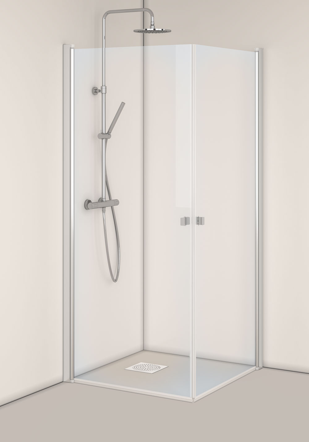 Romslig dusjhjørne med rette dører i klart glass og profiler og håndtak i aluminium eller matt svart. Når dusjen ikke er i bruk kan dusjdørene vinkles mot veggen, noe som frigjør plass på baderommet. Dusjhjørnet er stabilt med veggprofiler som kan monteres med skruer eller limbrikker. Den har en patentert løsning for enkel montering og justering, Hafa's InstaQuick™. Dørene har løftehengsler for at de ikke skal berøre gulvet når de åpnes og er vendbar slik at du kan velge hvordan de skal monteres. 6 mm herdet sikkerhetsglass. Full høyde 2000 mm. Kan monteres med utenpåliggende rør, 35 mm. 22 mm slepelist, magnetlist og håndtak inkludert.