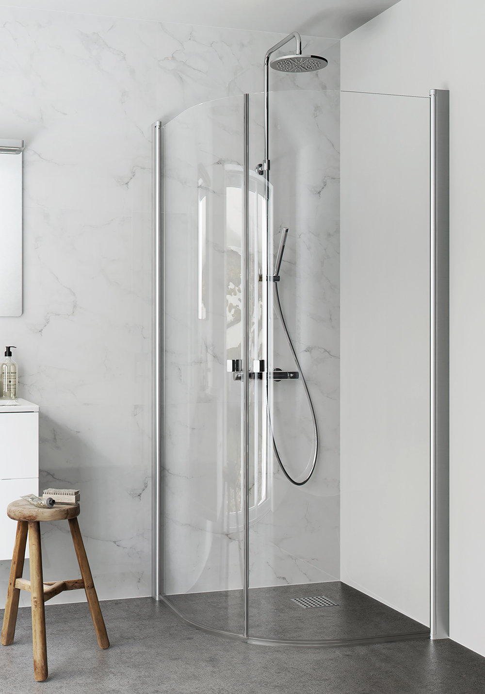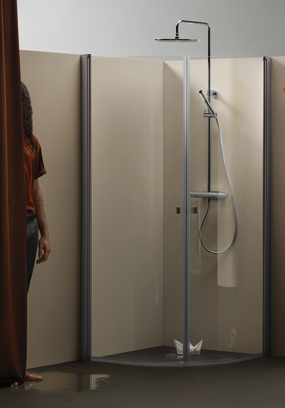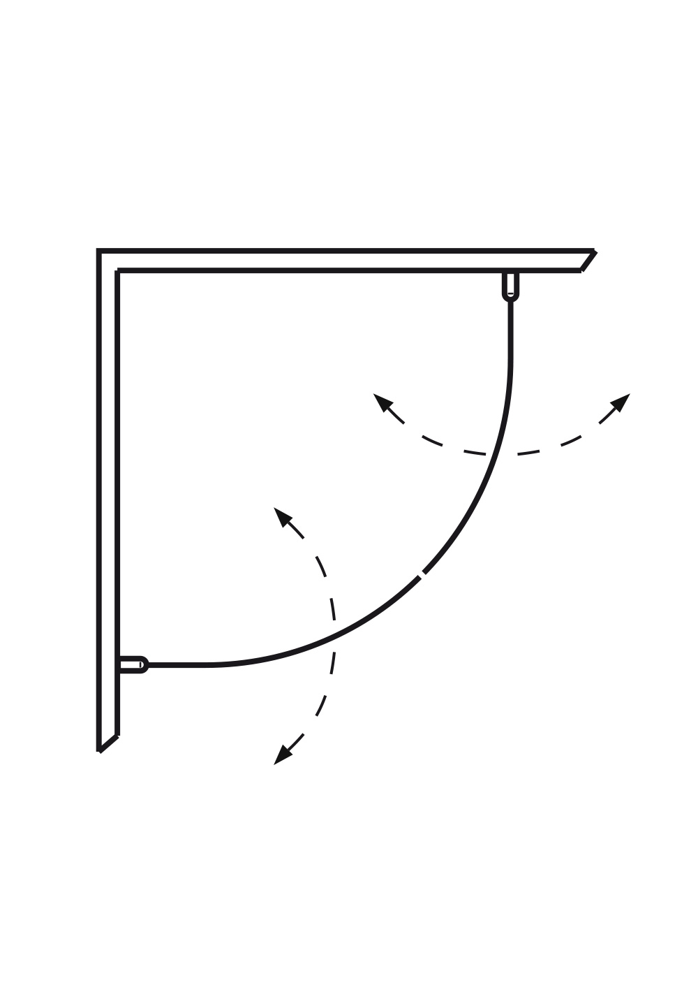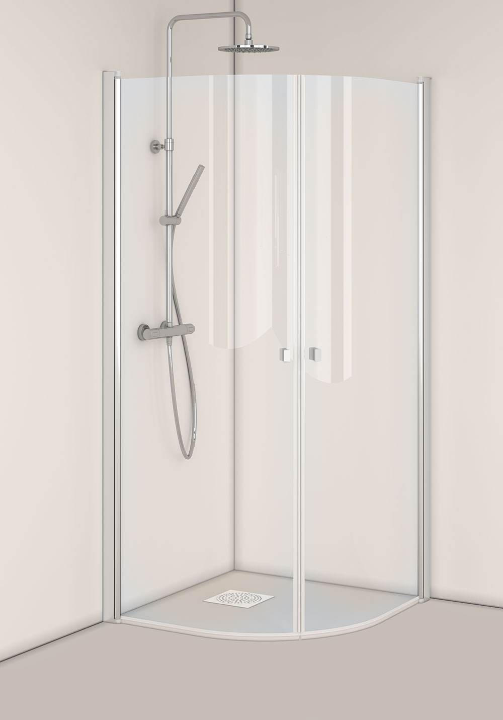 Dusjhjørne med limbare aluminiumsprofiler – rask montering. Kan enkelt installeres og justeres av én person takket være InstaQuick™. Vendbare dører. 6 mm herdet sikkerhetsglass. 8 mm frigang mot gulv. Høyde 2000 mm. Kan monteres med 12 mm utenpåliggende rør, cc 35 mm. 22 mm slepelist medfølger