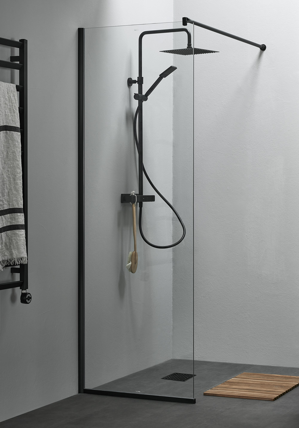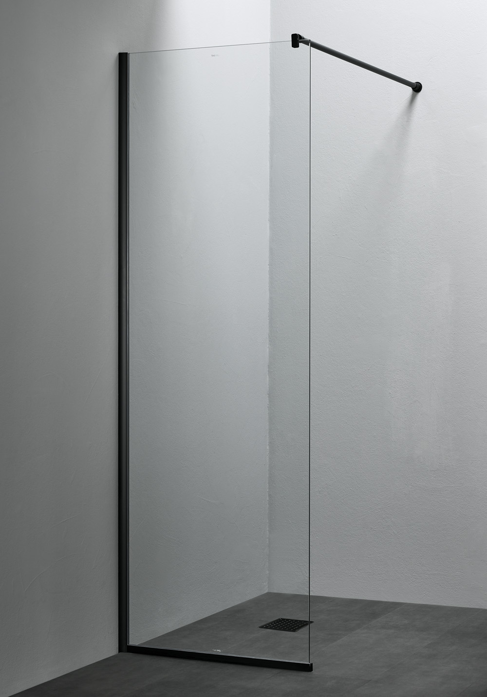 Klassisk dusjvegg i klart glass med profiler i aluminium eller svart matt mot vegg og gulv som gjør dusjveggen stabil og holder vannet inne. Dusjstangen kan monteres på tre måter: mot vegg, mot tak eller i vinkel mot samme vegg som dusjen monteres på. Stangen er 1200 mm lang og kan kappes til valgfri lengde. Vendbar. 8 mm herdet sikkerhetsglass. Høyde 2000 mm. Det finnes forlengelsesprofil for utenpåliggende rørtrekking.