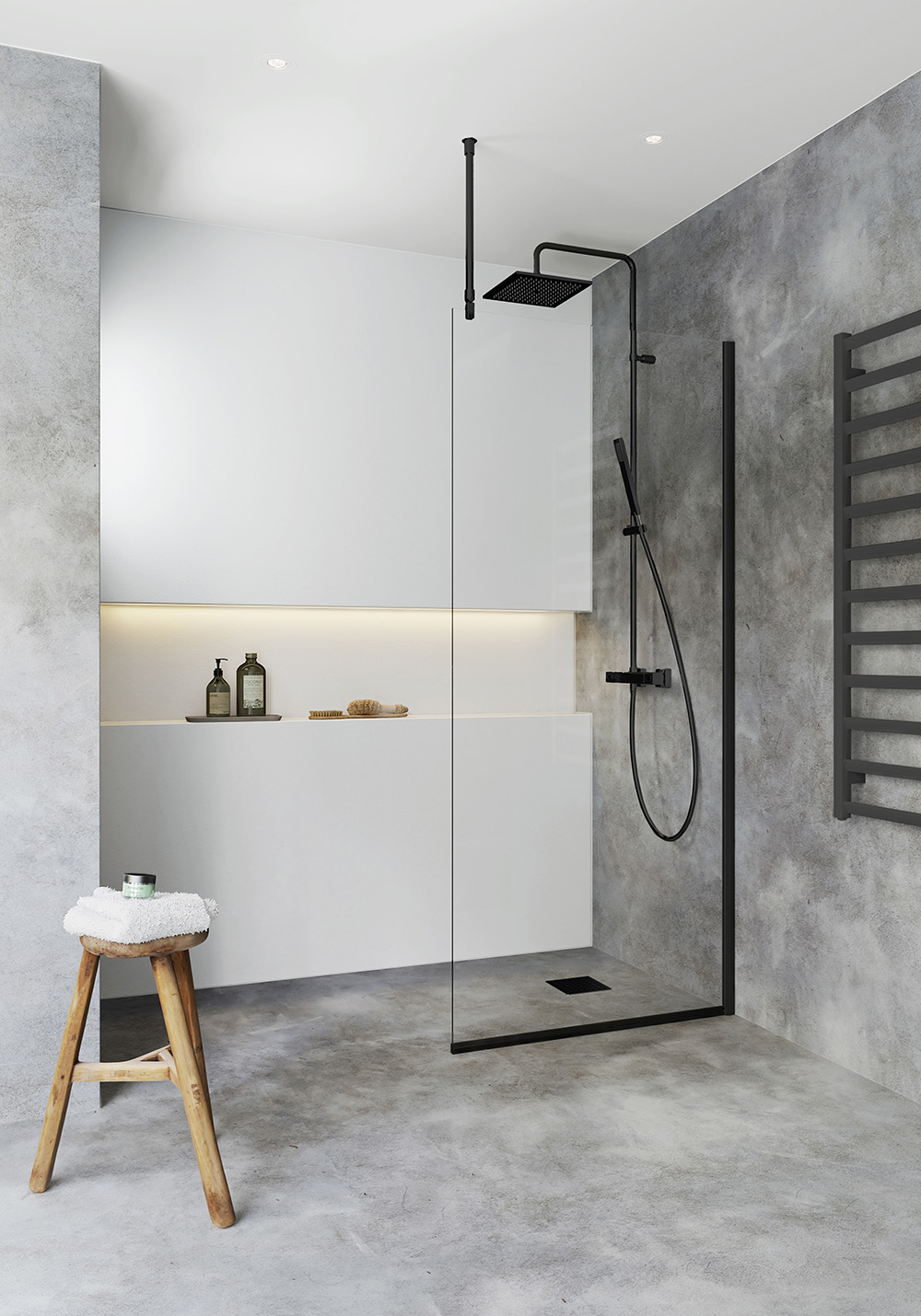 - Dusjvegg med limbar profil i aluminium eller svart matt