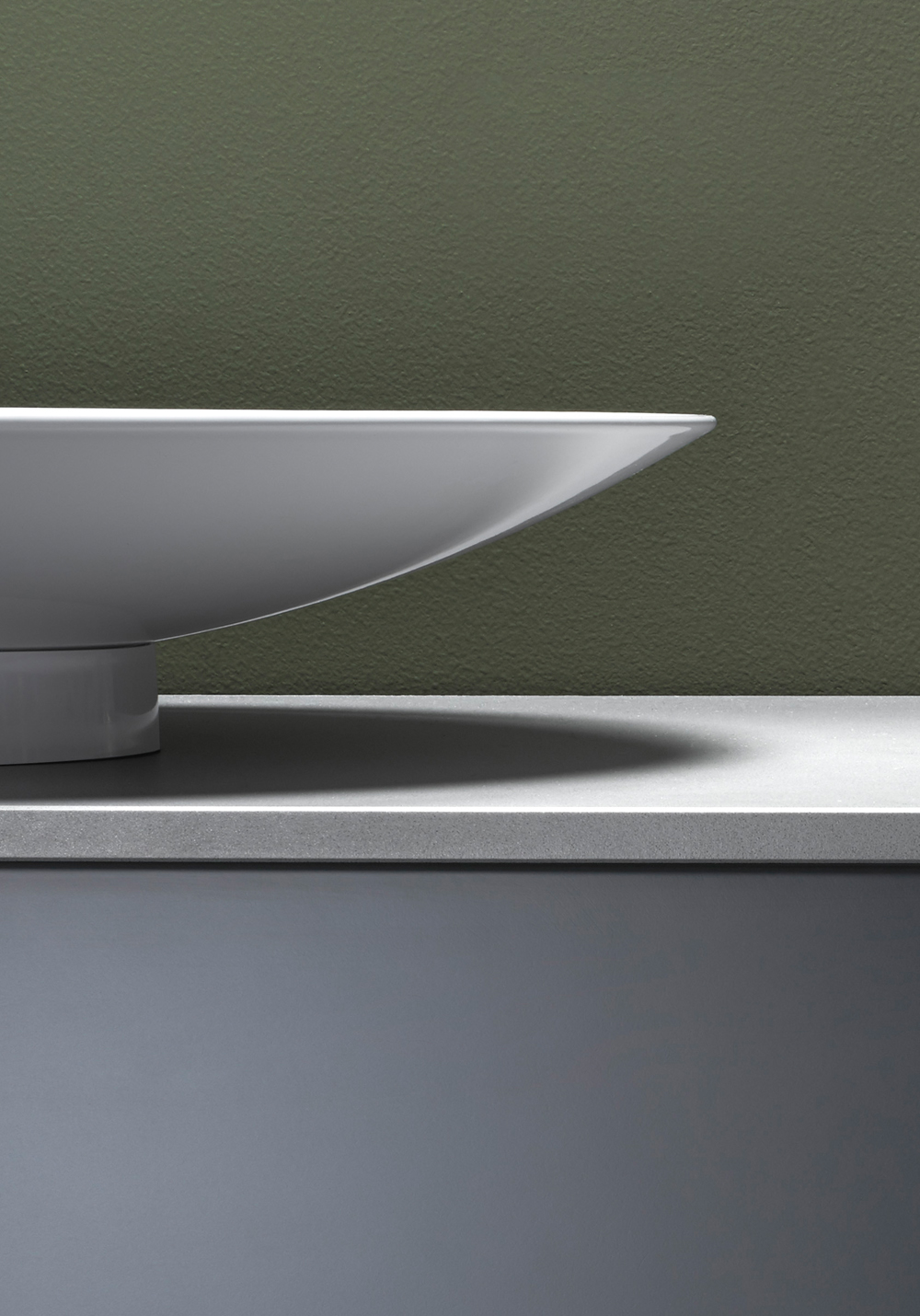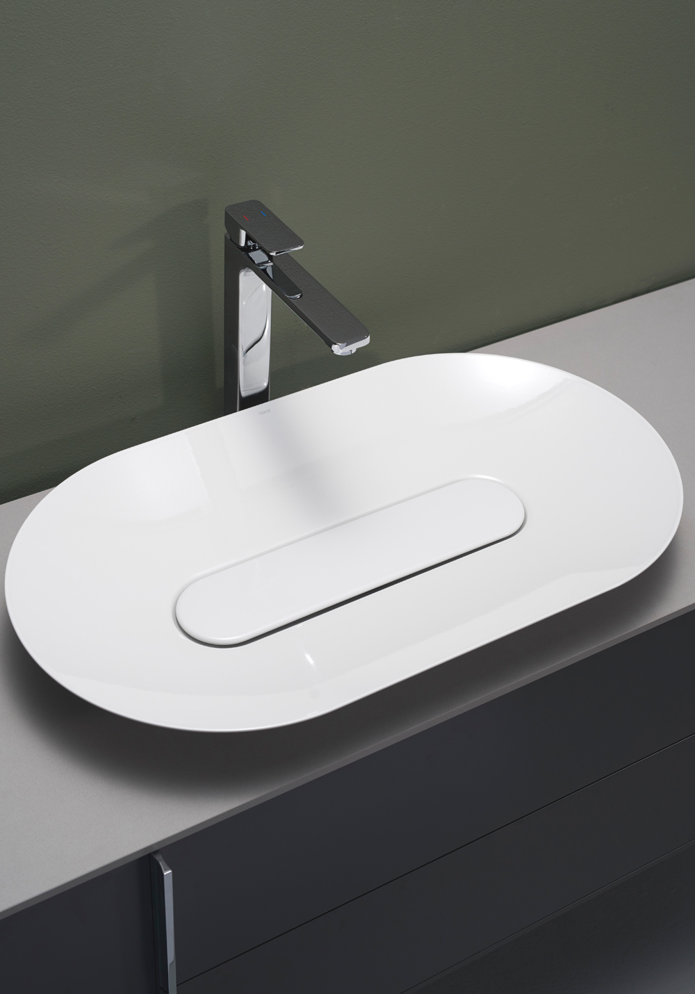 Unik supertynn oval frittstående servant i glassert stål. Passer sentrert over servantskap 800 og 1000. Pent designet skjult avløp. Integrert bunnventil inkludert, kan ikke lukkes.