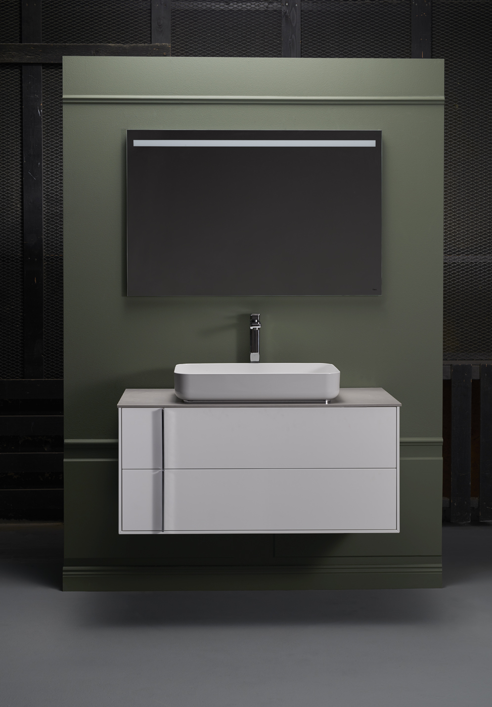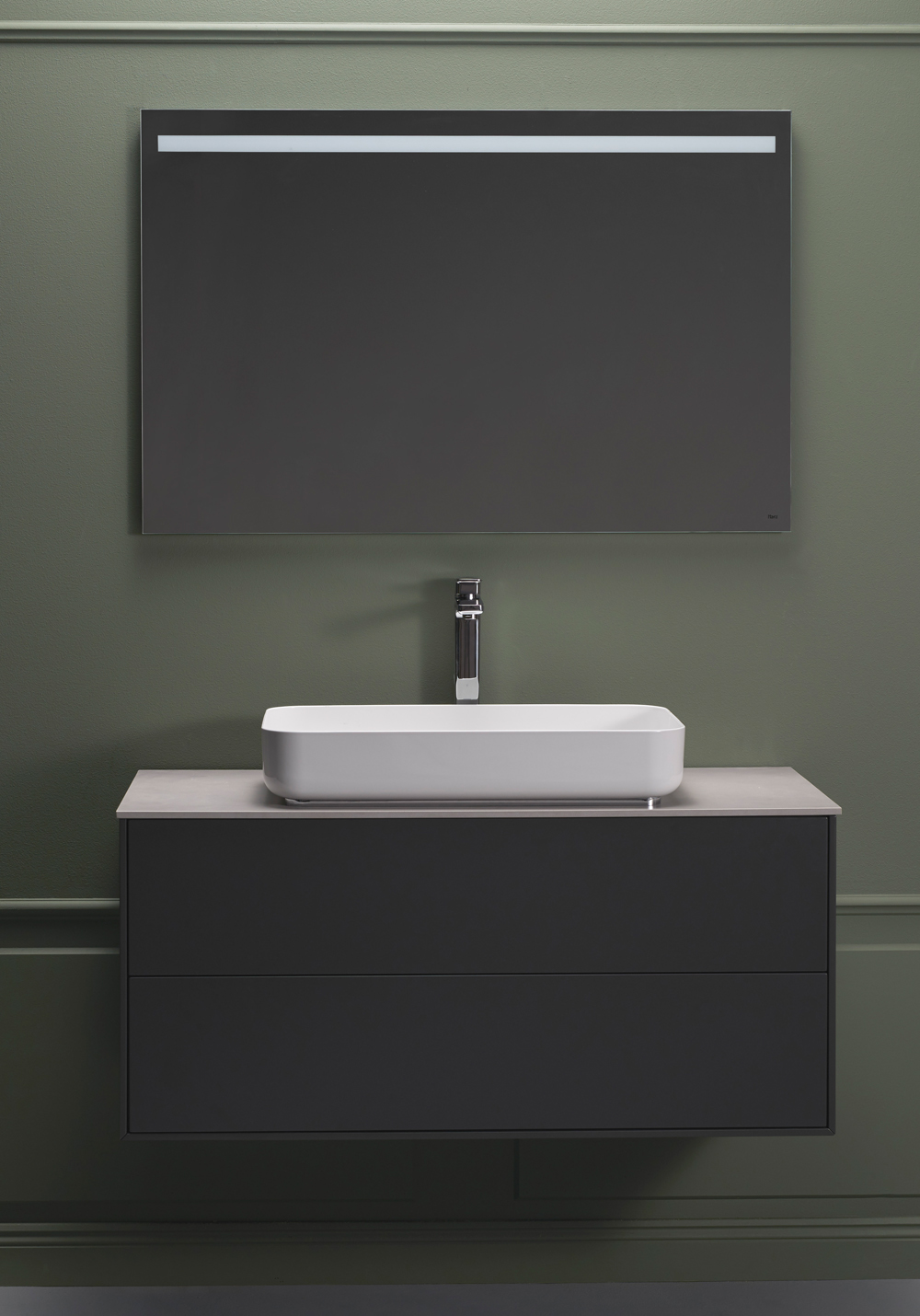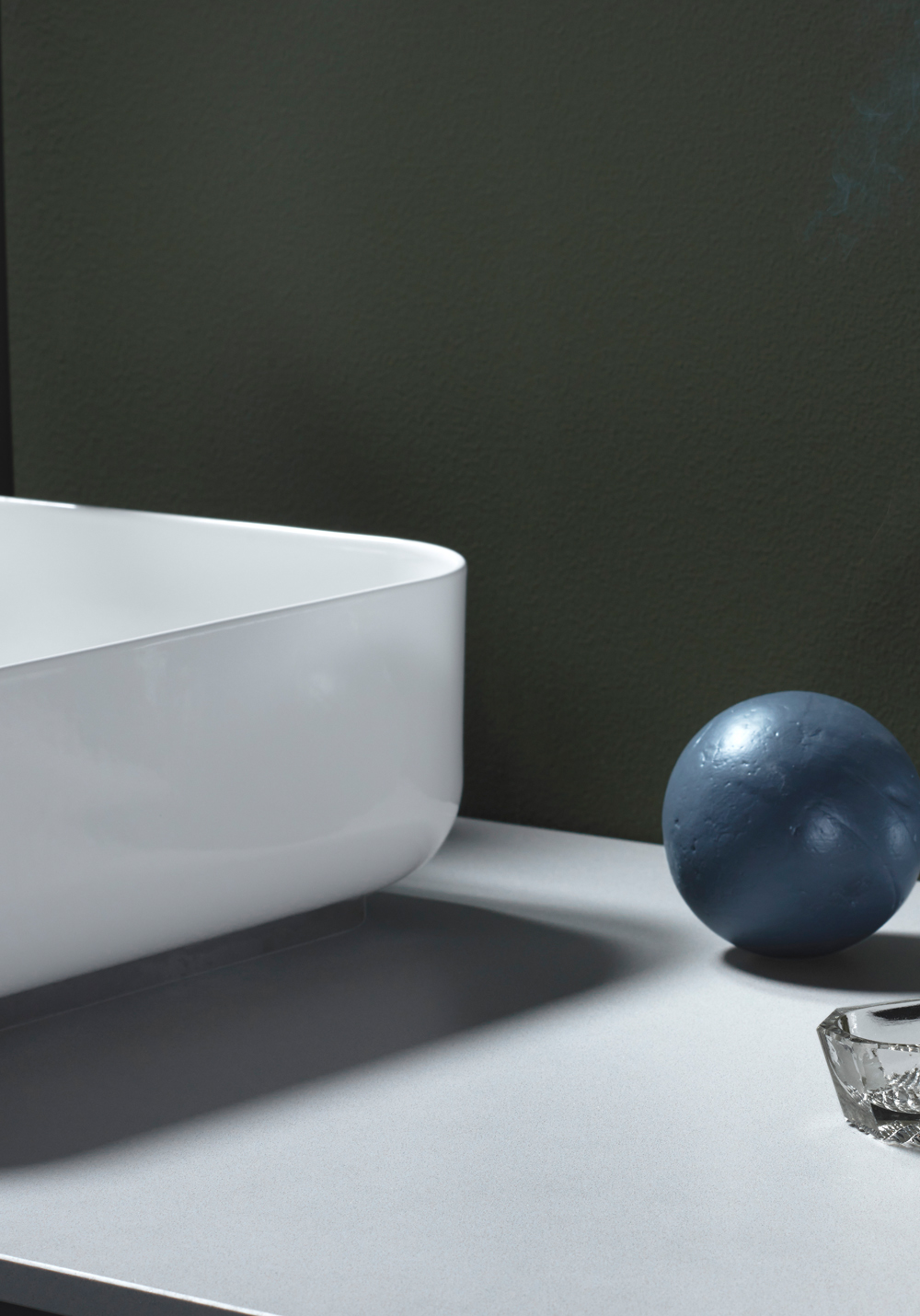 Rektangulært frittstående servant med rundede hjørner i glassert stål med tynne linjer. Passer sentrert over servantskap 800 og 1000.