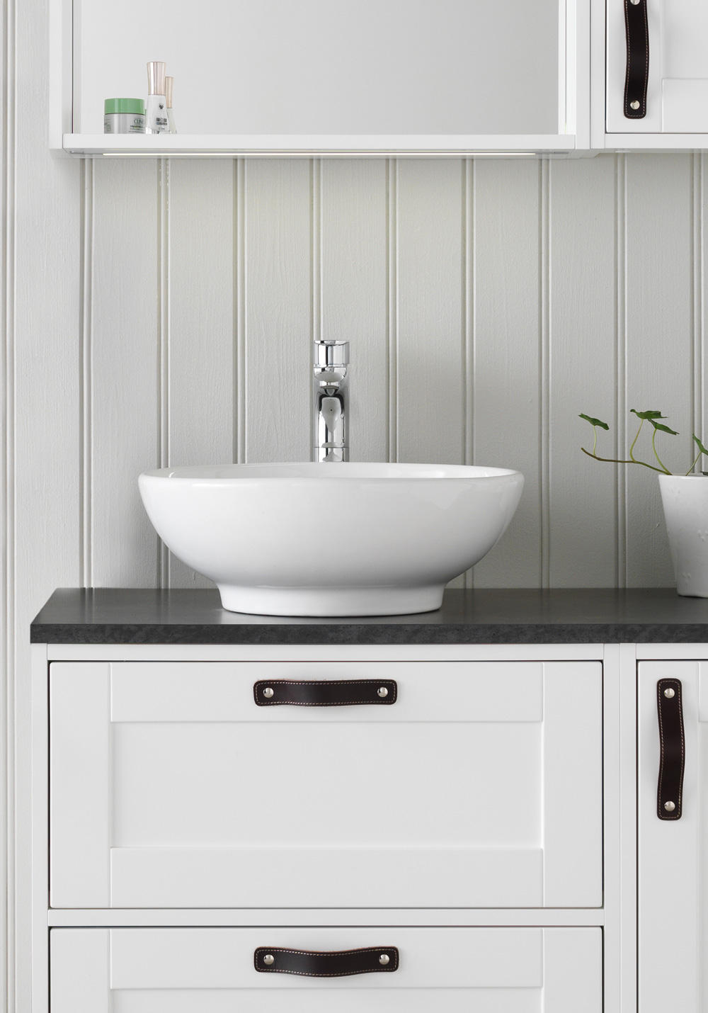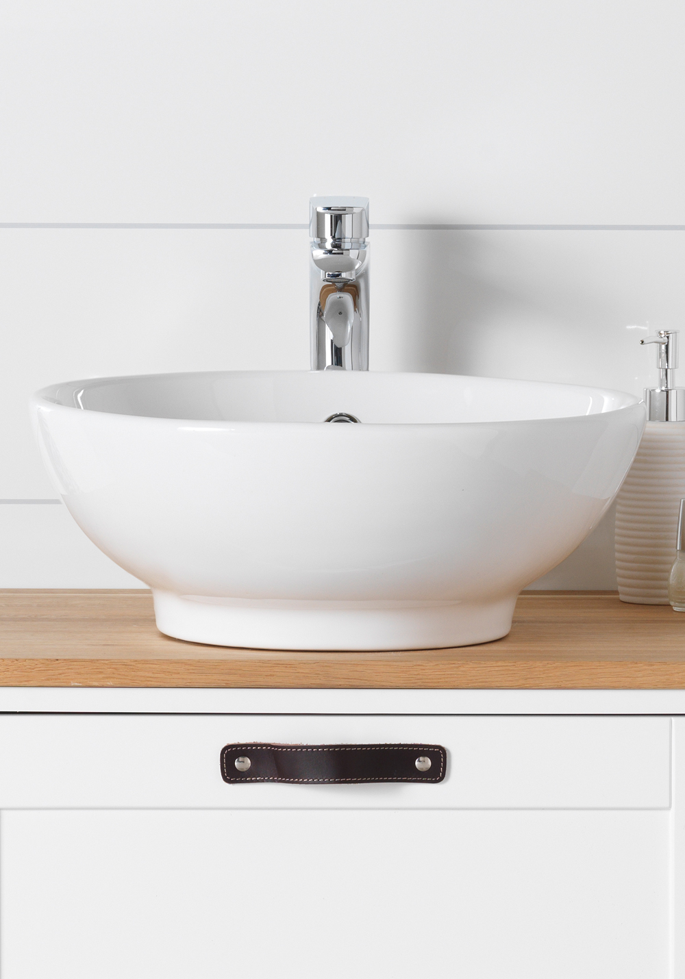 Klassisk rund frittstående servant i porselen med overløp. Kombineres med høyt blandebatteri som monteres på benkeplaten.