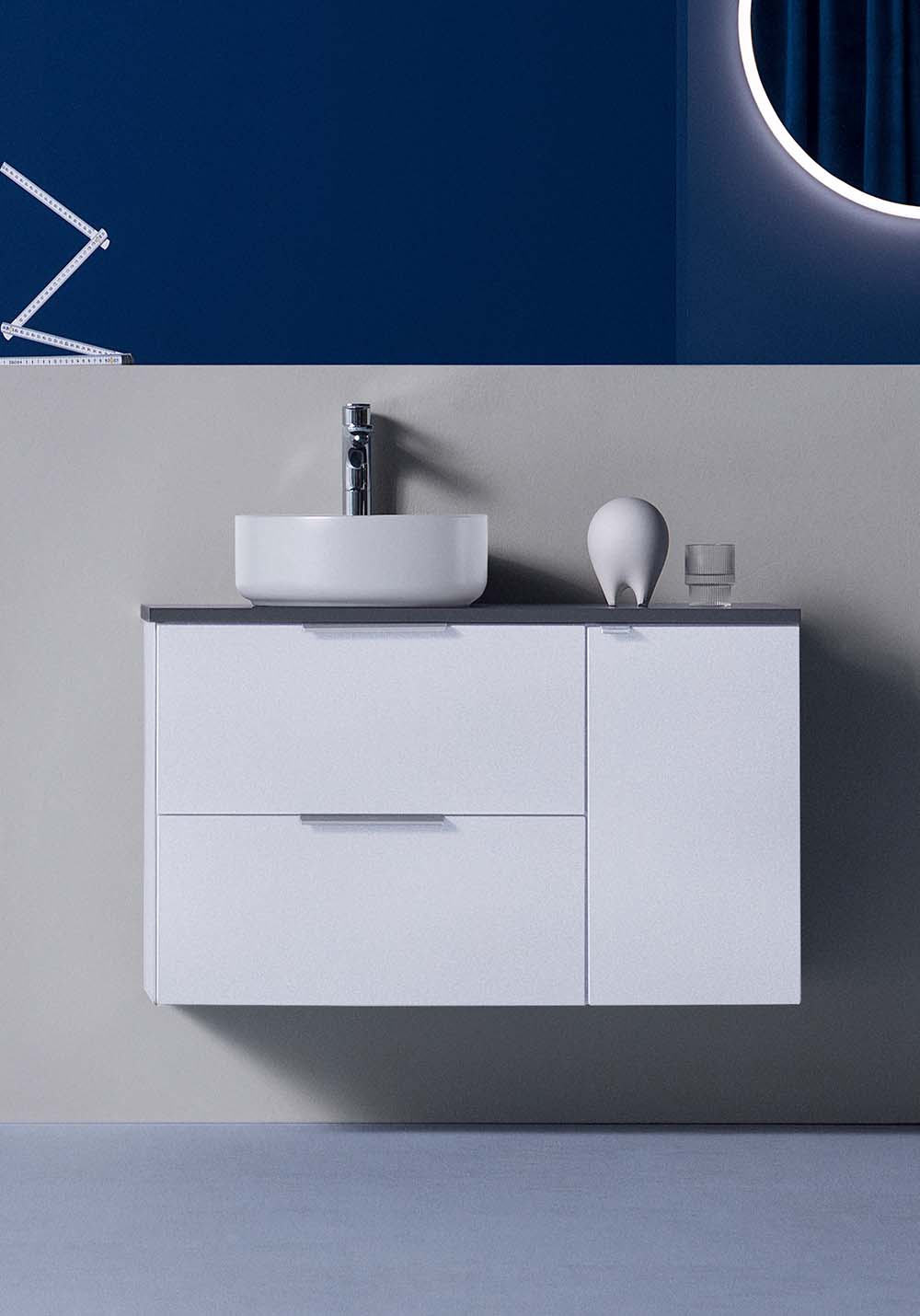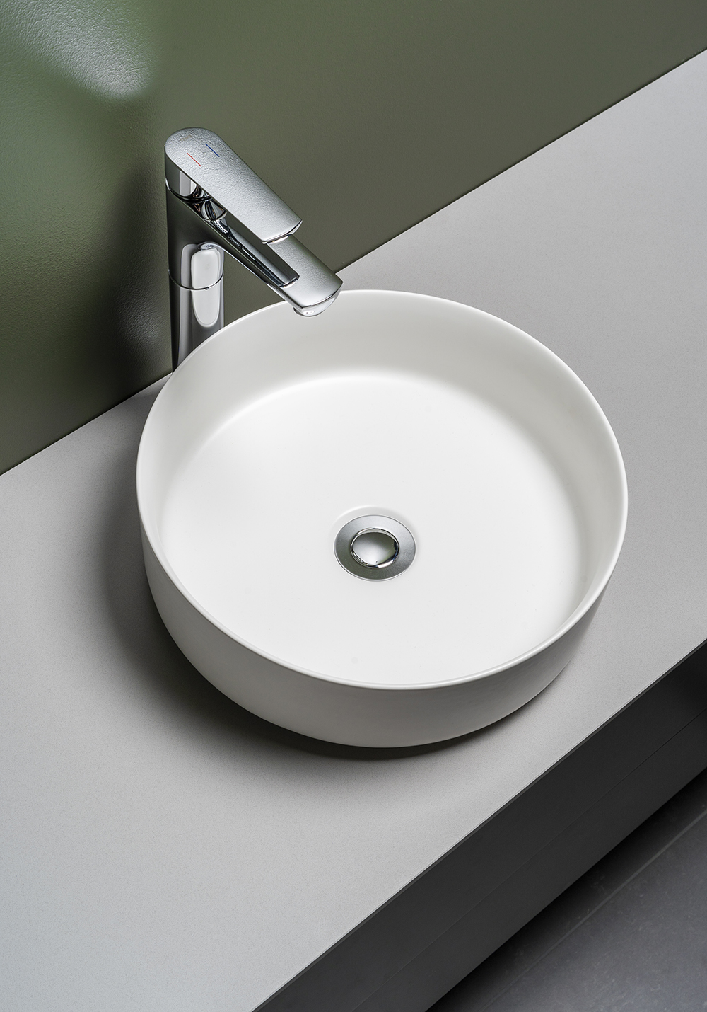 Tynt frittstående håndfat i porselen med hvit matt finish. Kombineres med høyt blandebatteri som monteres på benkeplaten. Køb til bundventil uden overløb der kan fås i flere farver der matcher din vandhane.