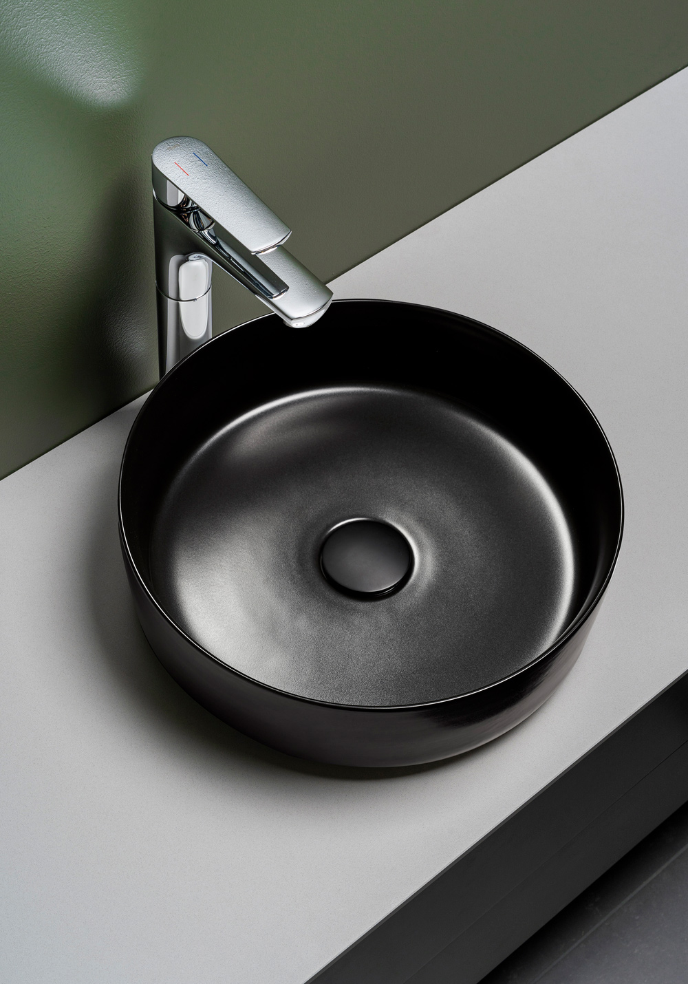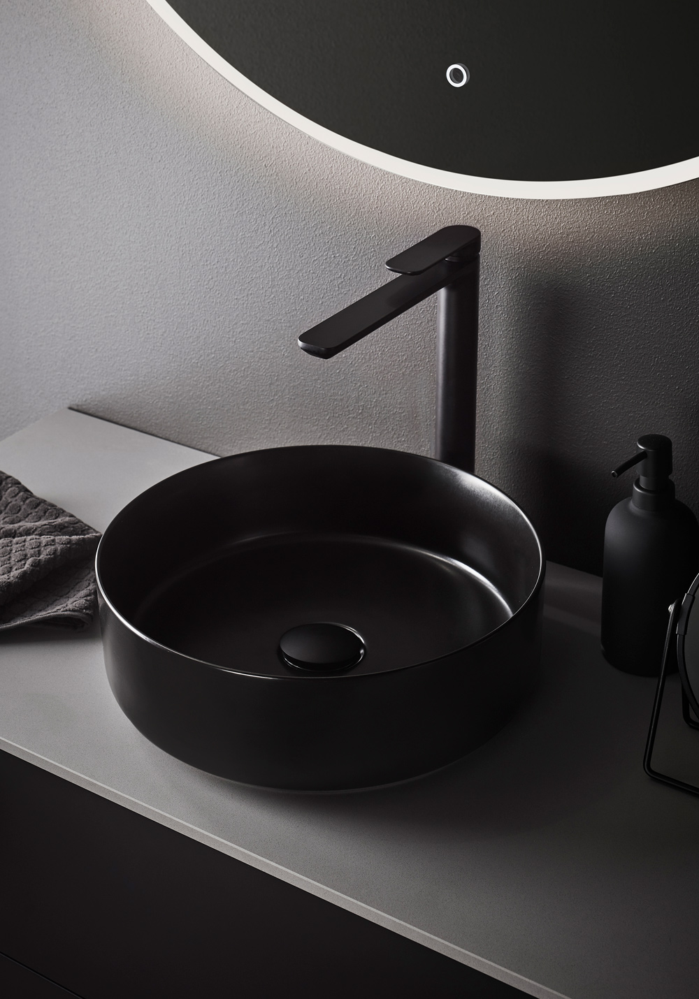 Tynt frittstående håndfat i porselen med svart matt finish uten overløp. Kombineres med høyt blandebatteri som monteres på benkeplaten. Køb til bundventil uden overløb der kan fås i flere farver der matcher din vandhane.