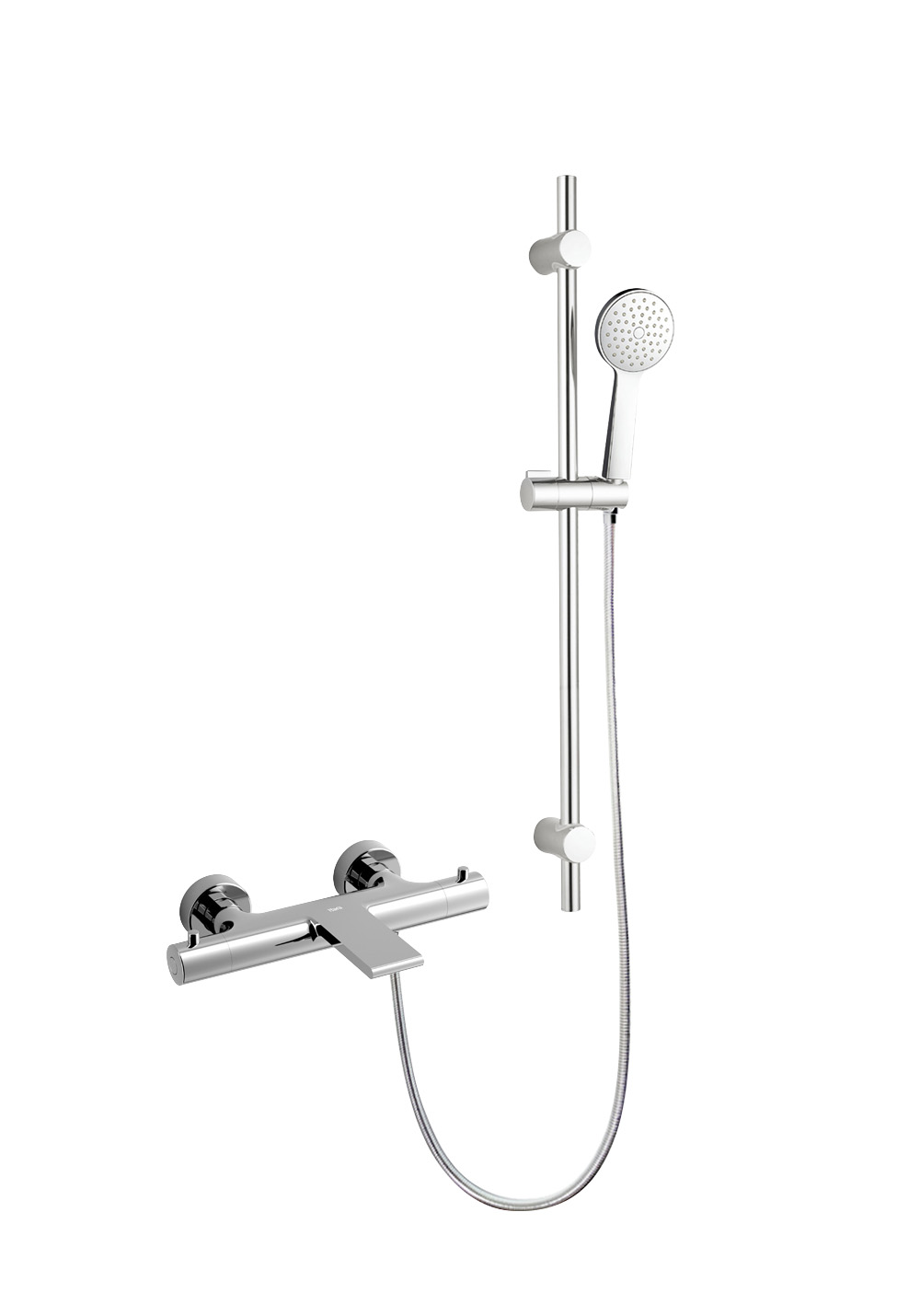 Dusjsett Gaia med badekarsbatteri Tide. Dusjhåndtak med Water Save og dusjslange med AntiTwist. Solid termostatbatteri av messing med skoldesperre og HeatProtection og badekarstut.